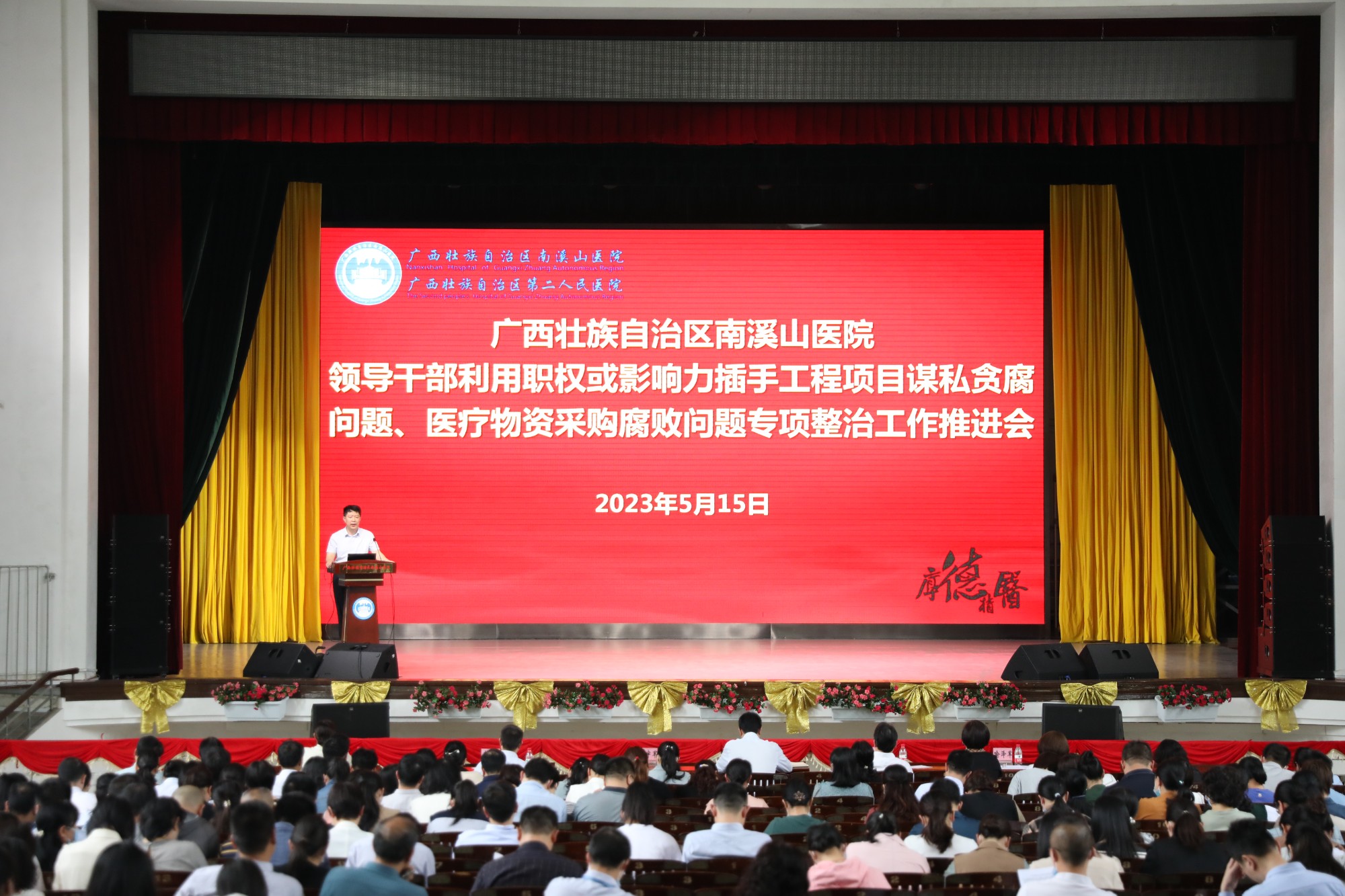 5月15日,自治区南溪山医院党委召开领导干部利用职权或影响力插手工程项目谋私贪腐问题、医疗物资采购腐败问题专项整治工作推进会。会上,医院纪委书记喻泽军对专项整治工作进行部署,医院党委书记戴前富讲话。医院全体党、政领导班子成员,各党支部(总支)书记,全体中层干部参加会议。