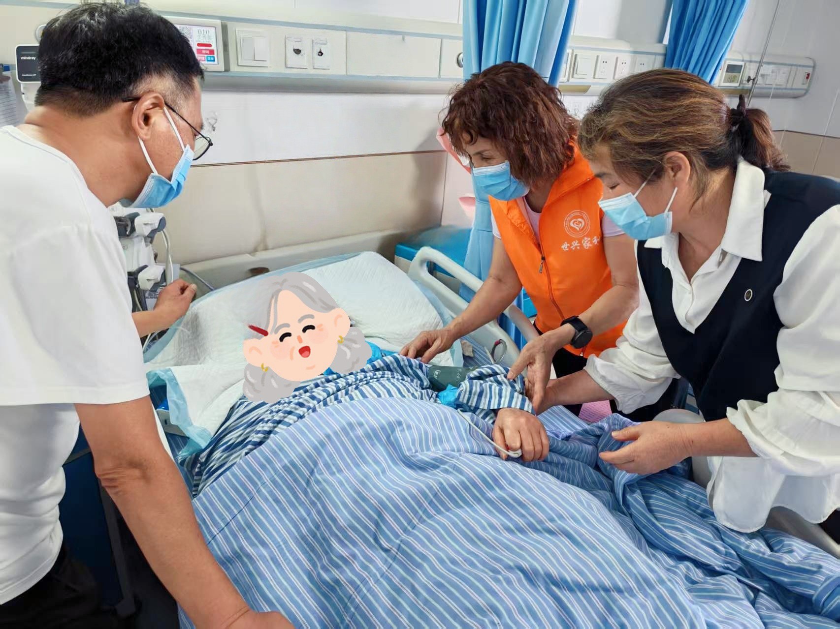 志愿者们分两批次,一对一守护在老人身边。他们轻柔运用“扶触”技巧——或稳稳握住老人布满岁月痕迹的手掌,传递支持于关怀;或温和抚触手臂、手背,如无声的安抚乐章。这种充满尊重与边界的肢体接触,有效缓解焦虑,让老人感知“你并不孤单”。同时,志愿者们将“零极限”技术内化于心,默念“对不起、请原谅、谢谢你、我爱你”,以此净化自身心境,将平静、慈悲与全然接纳的能量带入病房,营造安宁平和的氛围。