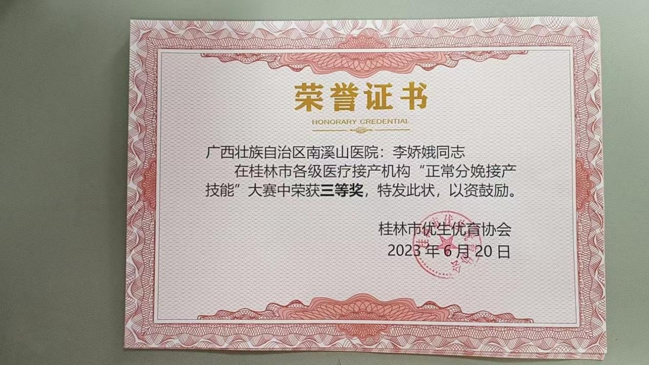 6月20日,中国妇幼保健协会、中国妇幼保健协会母婴健康培训基地、中国妇幼保健协会助产士分会在桂林联合举办2023年首届正常分娩接产技能大赛,广西壮族自治区南溪山医院参赛选手李娇娥荣获三等奖。