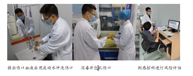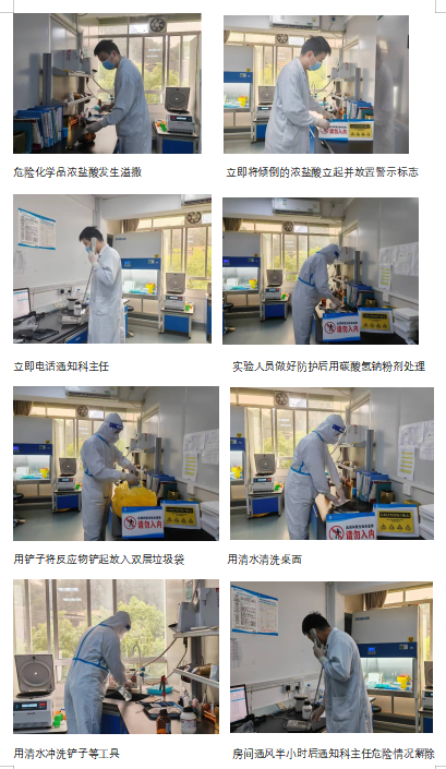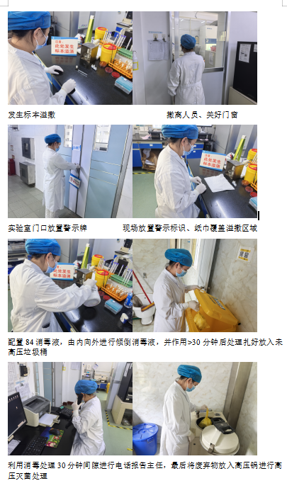 培训结束后,在科主任的主持下,针对实验室应急预案内容,开展了“工作人员针刺伤”、“危化品溢撒”和“标本溢撒”等安全事故应急处置演练,将日常工作可能出现的安全环节让人人熟知,人人会应对。