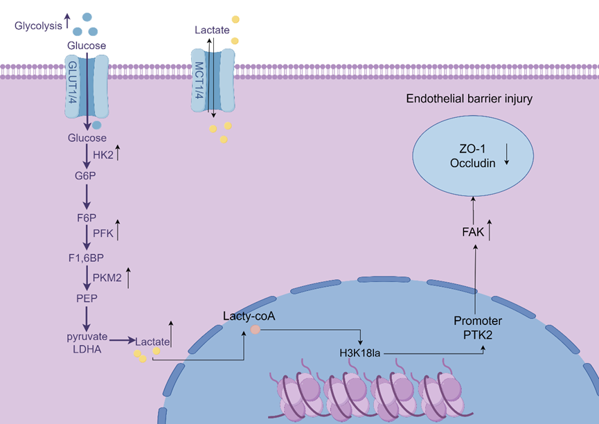 本研究聚焦梅毒螺旋体关键致病性脂蛋白Tp0768的生物学作用。研究发现,Tp0768作用于内皮细胞后,可显著提高乳酸分泌水平及组蛋白整体乳酸化修饰水平。进一步机制研究表明,Tp0768显著上调内皮细胞组蛋白H3第18位赖氨酸(H3K18)的乳酸化修饰水平。功能实验证实,增强的H3K18乳酸化修饰通过提高PTK2基因启动子区域的染色质可及性,直接促进PTK2表达,进而下调紧密连接蛋白ZO-1和occludin的表达水平,导致内皮通透性增加。该研究从代谢-表观遗传调控角度阐明了梅毒螺旋体破坏内皮屏障的新机制。