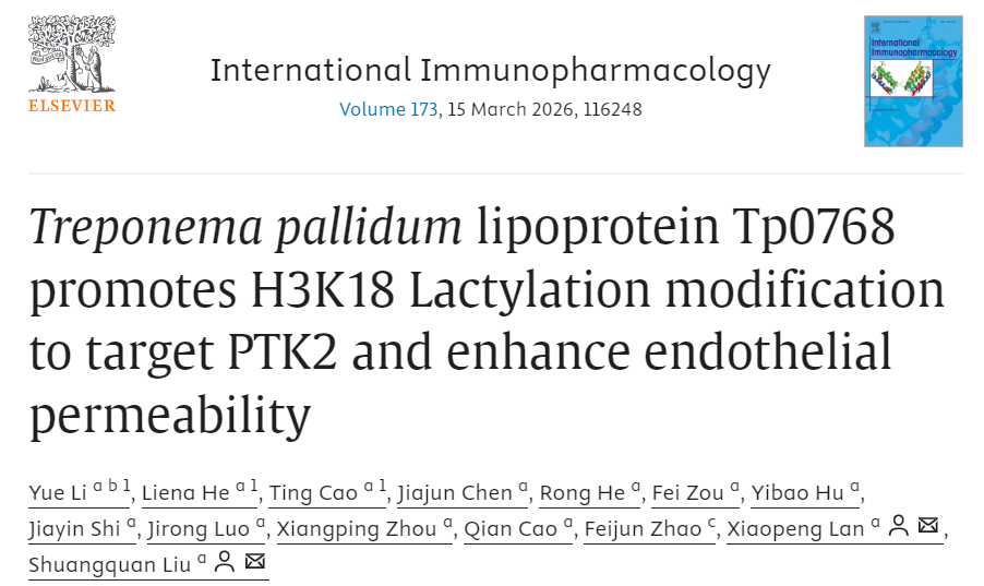 近日,广西壮族自治区南溪山医院(广西壮族自治区第二人民医院)检验科李粤检验师在国际权威期刊《International Immunopharmacology》(中科院二区,影响因子4.7)发表题为《Treponema pallidum lipoprotein Tp0768 promotes H3K18 Lactylation modification to target PTK2 and enhance endothelial permeability》的最新研究成果。南溪山医院检验科为论文第二完成单位及第一作者单位。