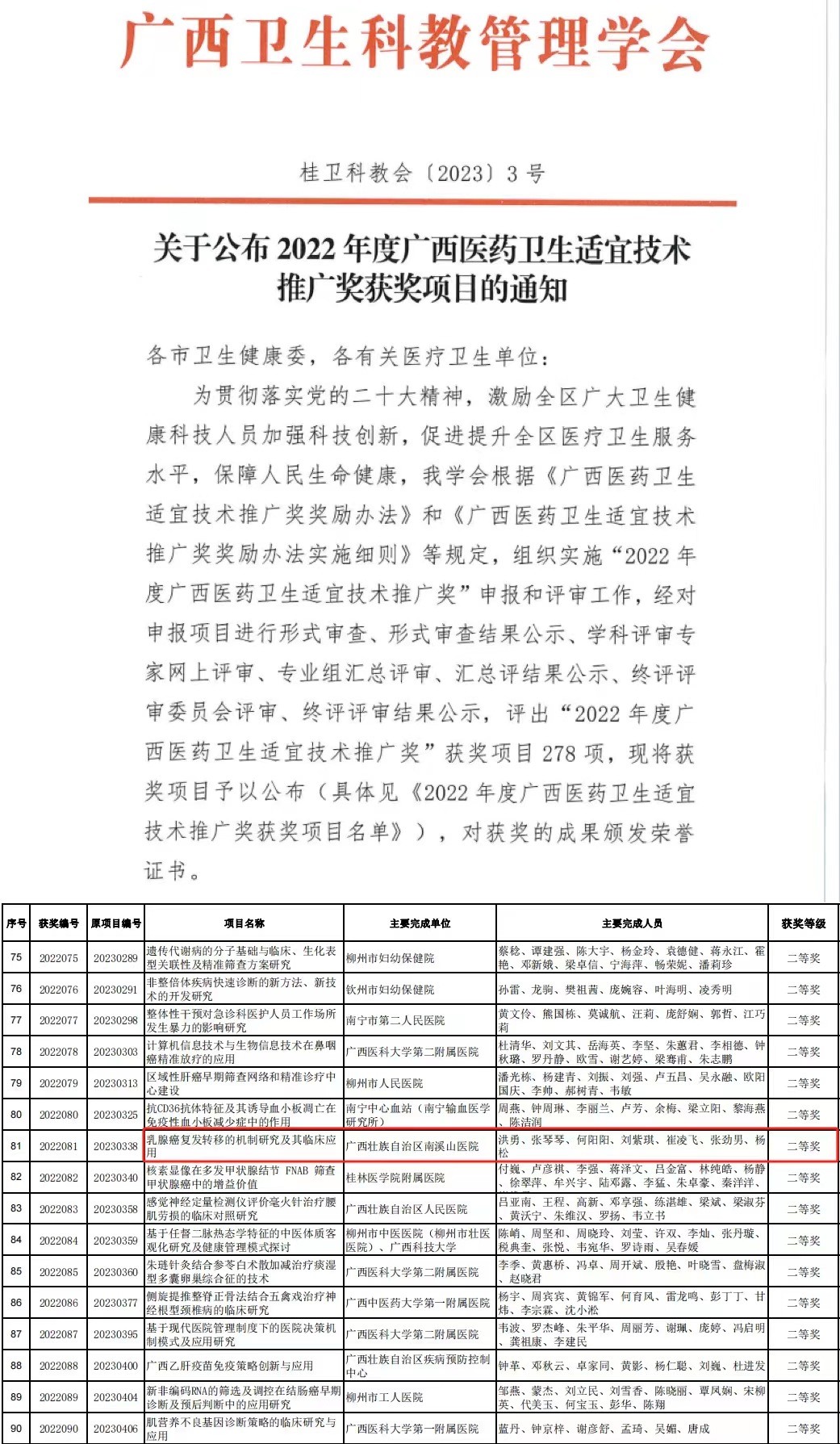 近日,广西卫生科教管理学会正式发布《关于公布2022年度广西医药卫生适宜技术推广奖获奖项目的通知》,广西壮族自治区南溪山医院《乳腺癌复发转移的机制研究及其临床应用》课题获得2022年度广西医药卫生适宜技术推广奖二等奖。