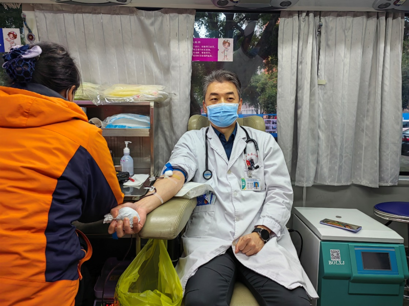 献血队伍中,有许多刚刚忙完医疗工作的白衣天使。心脏大血管外科支部书记、副主任轩永波带领其科室党员们积极献血,并表示:“我们心外科病人手术用血多,现阶段血液资源紧张,我们愿意献出热血,去救治病人。”据悉,这已经是他多年连续参加无偿献血活动了。此外,还有刚献完血就忙碌在救死扶伤第一线的医务人员。泌尿外科廖彬主治医师及其同事们一并前来献血。当天下午,廖医生还需进行一台巨大(18cm×15cm×14cm)肾脏占位性病变摘除的手术,他希望通过无偿献血奉献爱心,挽救更多生命。