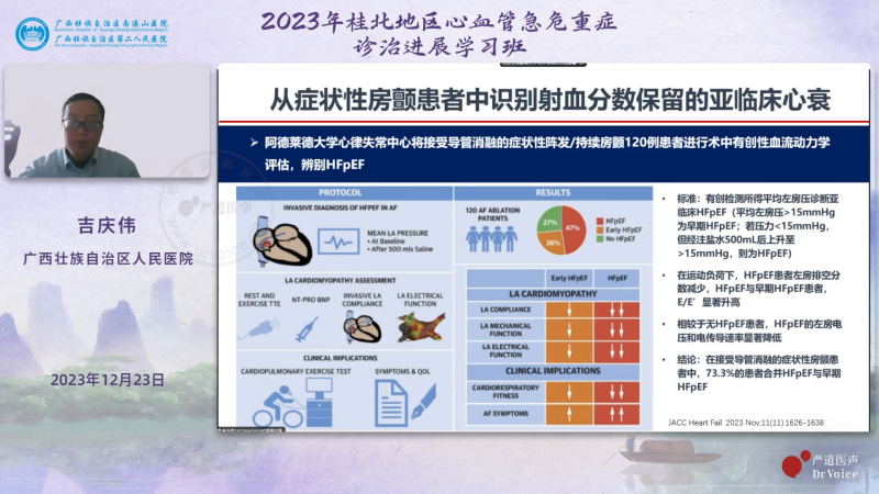 12月23日,为提高桂北地区心血管急危重症诊疗水平, 由广西壮族自治区南溪山医院心血管内科通过线上直播的形式,成功举办2023年桂北地区心血管急危重症诊治进展学习班。