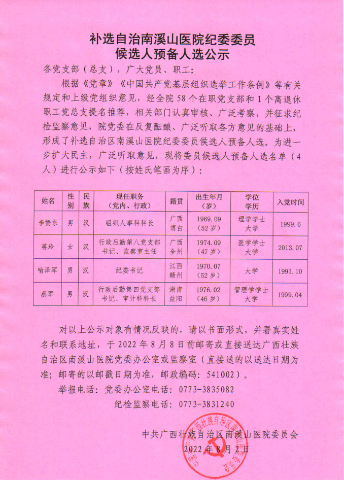 补选自治区南溪山医院纪委委员候选人预备人选公示-通知公告-院务公开-广西壮族自治区南溪山医院【官方网站】