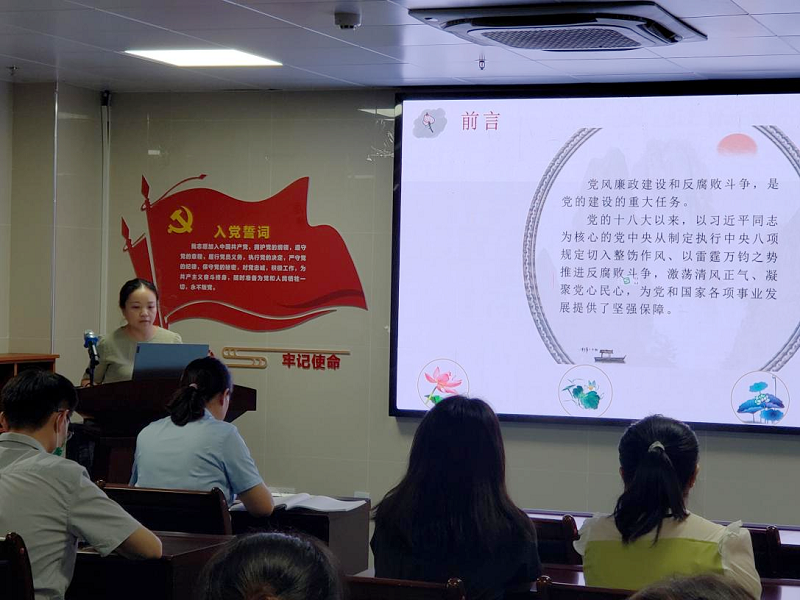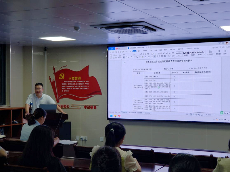 活动中,支部全体党员观看了自编自演的清廉医院宣传视频《全面加强党的建设 打造清廉南医》,深刻领悟了医疗机构工作人员廉洁从业九项准则。支部委员韦姗以该视频为切入点为党员上了题为《激荡清风正气 凝聚党心民心》的党课,纪检委员付彬向支部党员提出了加强监督职责,落实廉洁风险防控的具体要求,强调在支部各科室开展建立“清单式监督”模式,进一步加强对关键岗位的监督,助推清廉南医建设。