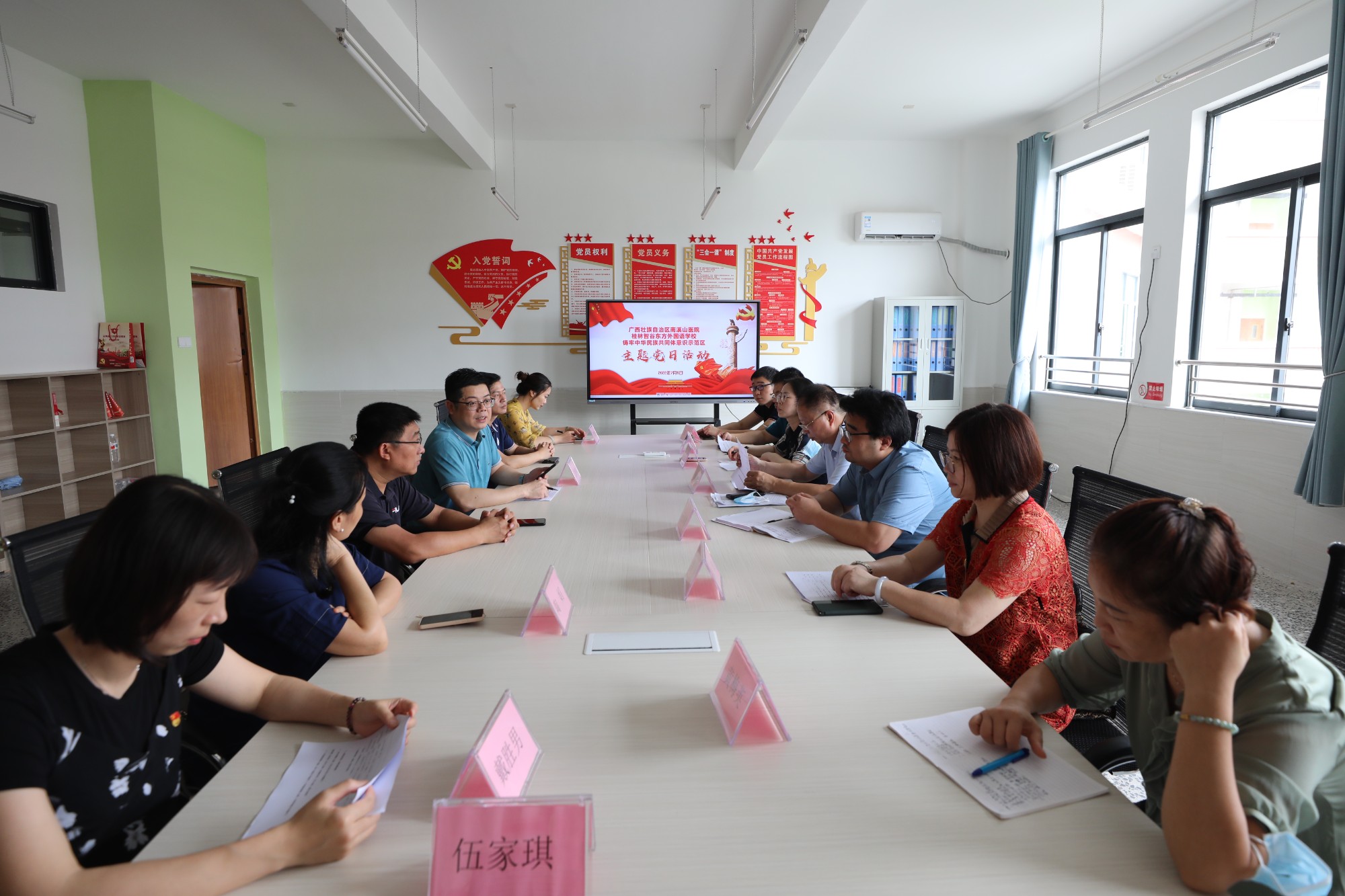 7月5日,广西壮族自治区南溪山医院党委副书记、工会主席张超群带领该院行政后勤各党支部代表一行11人来到桂林智谷东方外国语学校开展行动学习进支部主题活动及“建设铸牢中华民族共同体意识示范区”主题党日活动。同时双方代表齐聚一堂,就联合举办医院职工子弟开办假期托管班的相关事宜进行了调研、协商和讨论。
