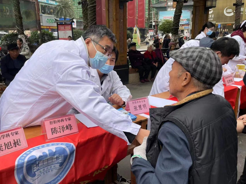 肝胆胰脾外科主任医师张慧明、副主任医师陈泽峰、主治医师何则亮为群众进行检查及解答
