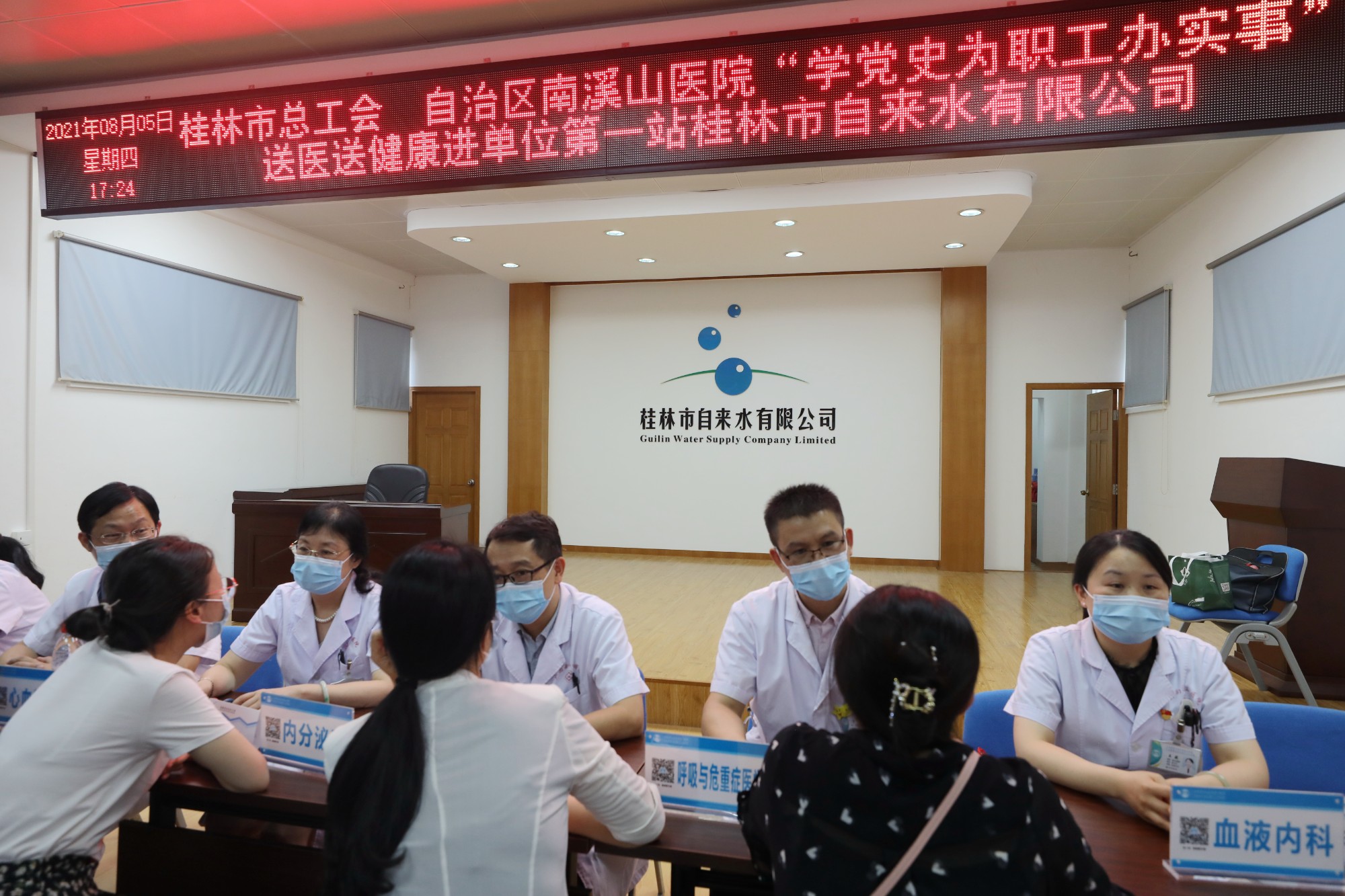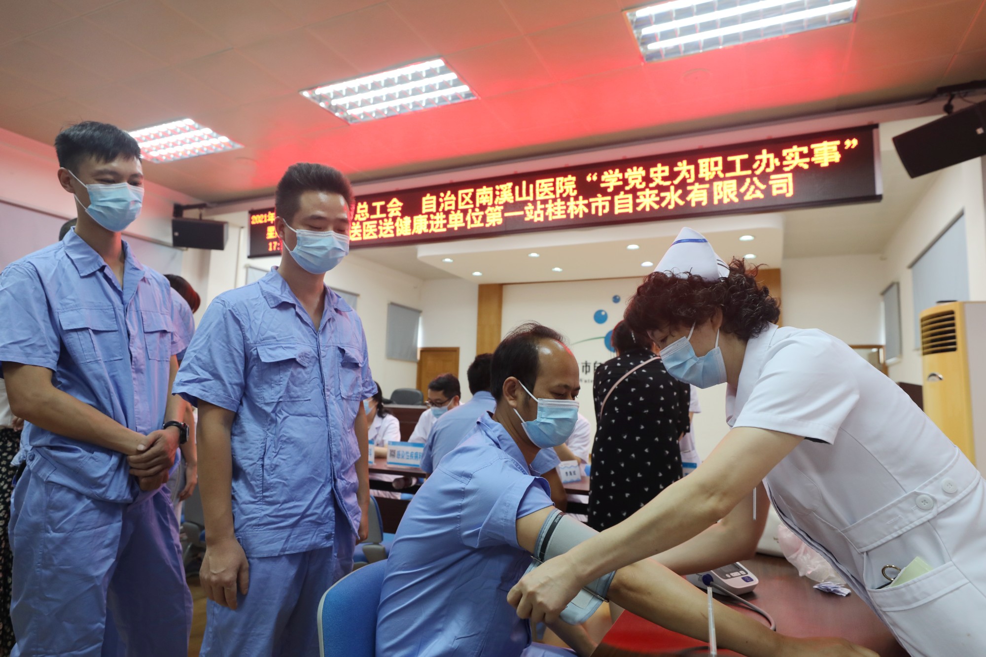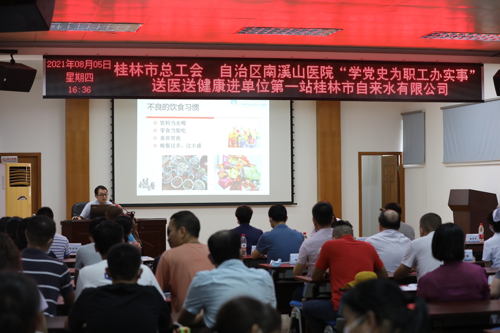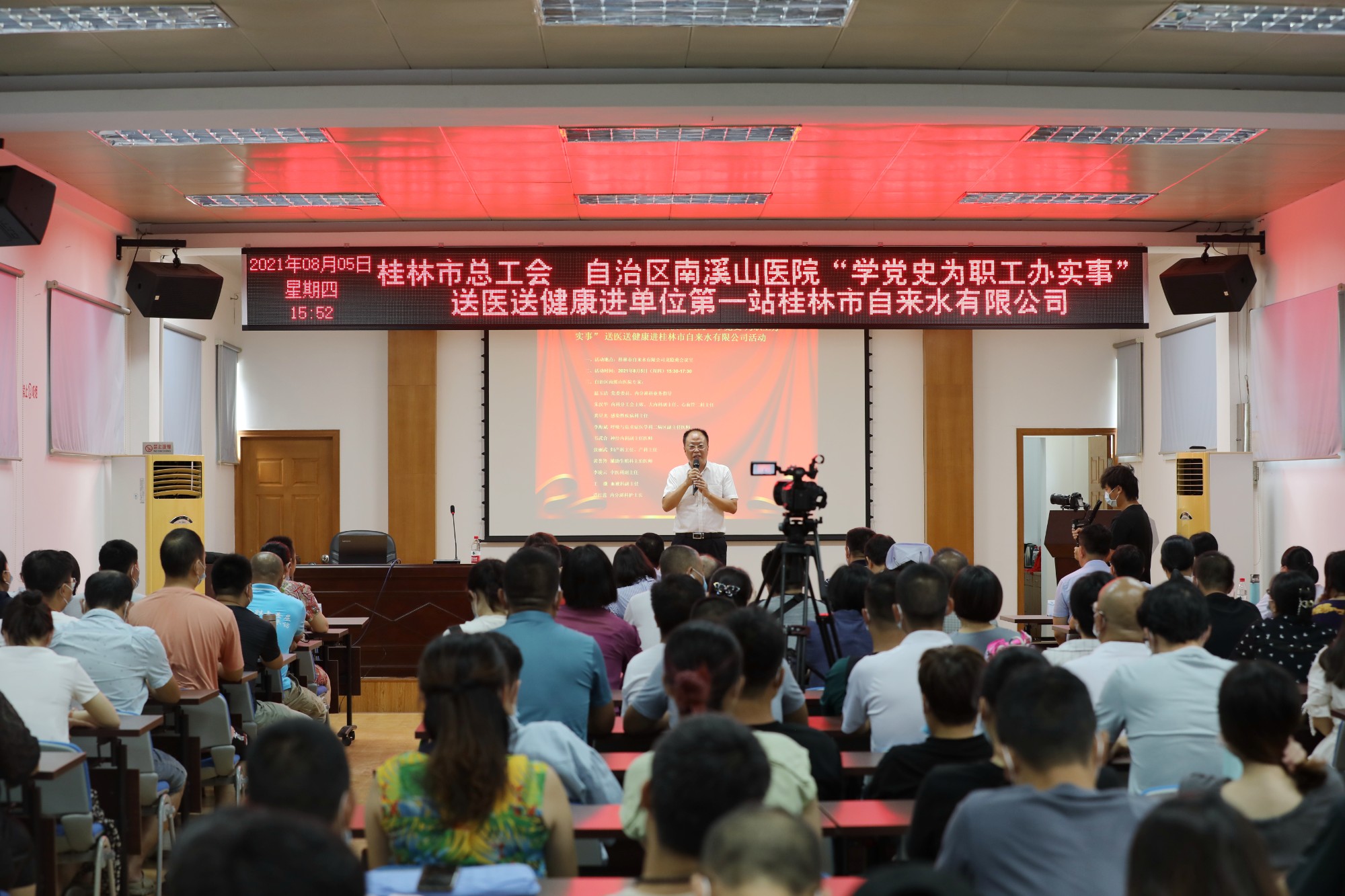 8月5日,桂林市总工会与自治区南溪山医院联合开展的“学党史 为职工办实事”送医送健康进单位系列活动的首站走进了桂林市自来水公司,医护人员们为该公司110余名职工作了健康专题讲座并开展义诊活动。