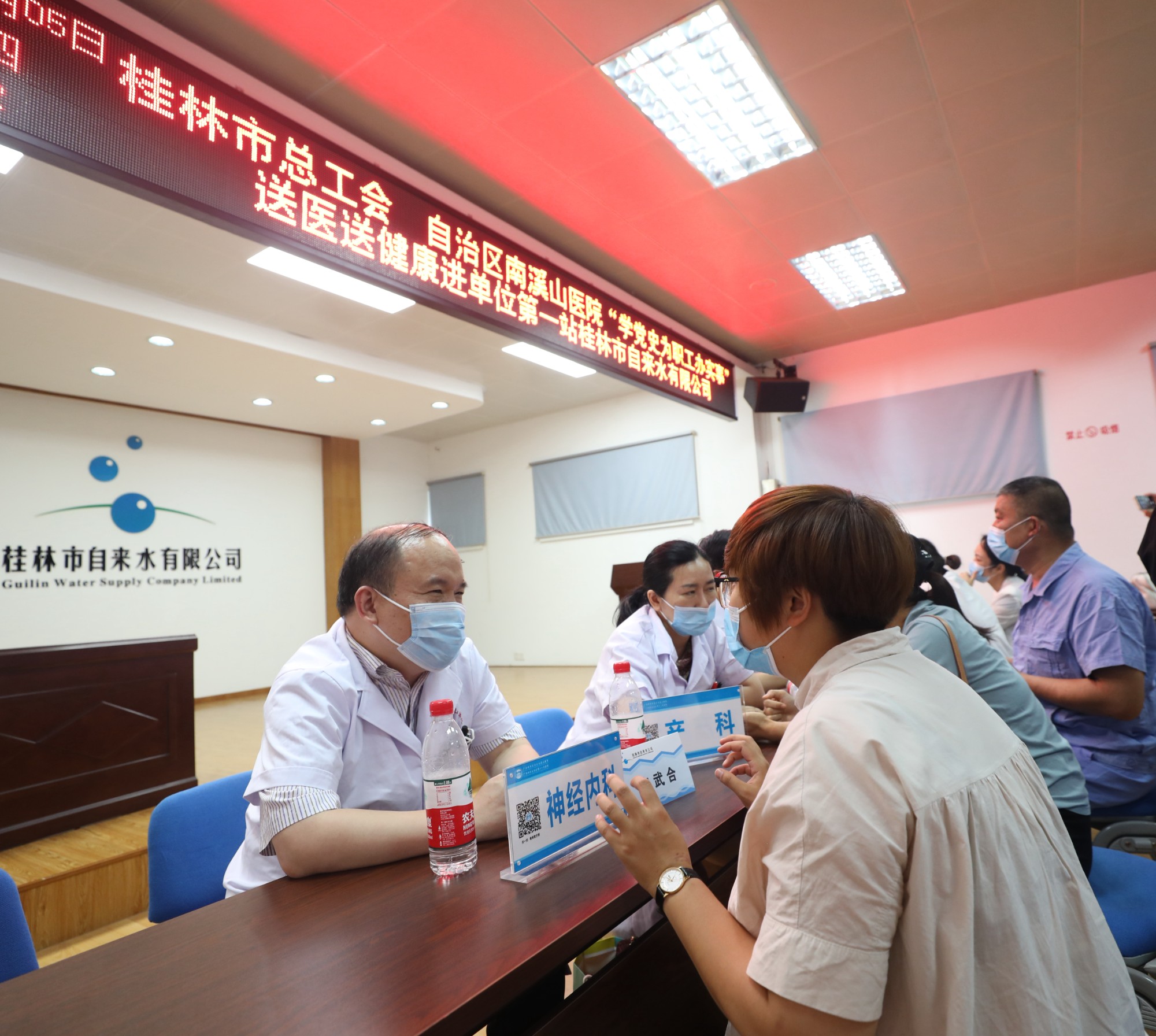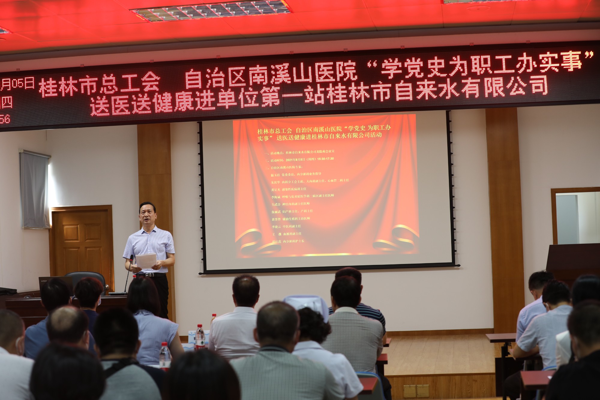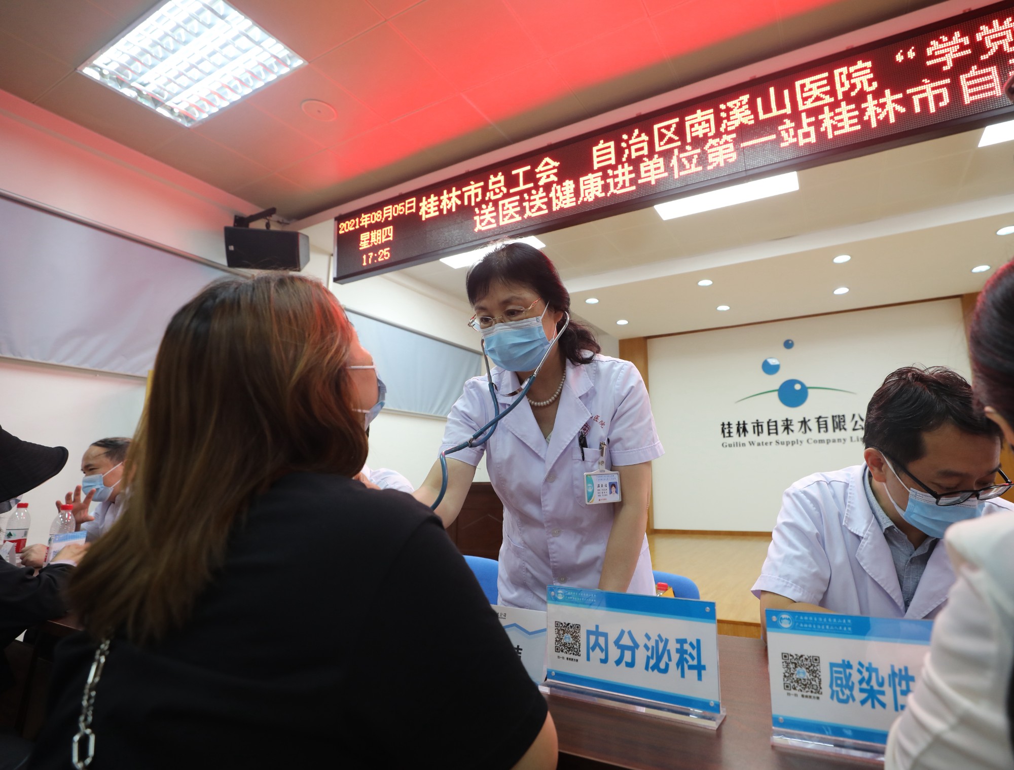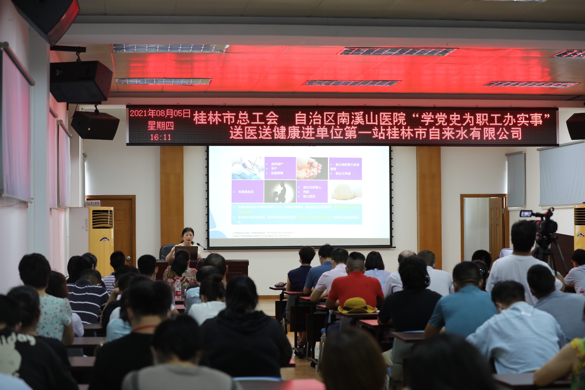 8月5日,桂林市总工会与自治区南溪山医院联合开展的“学党史 为职工办实事”送医送健康进单位系列活动的首站走进了桂林市自来水公司,医护人员们为该公司110余名职工作了健康专题讲座并开展义诊活动。