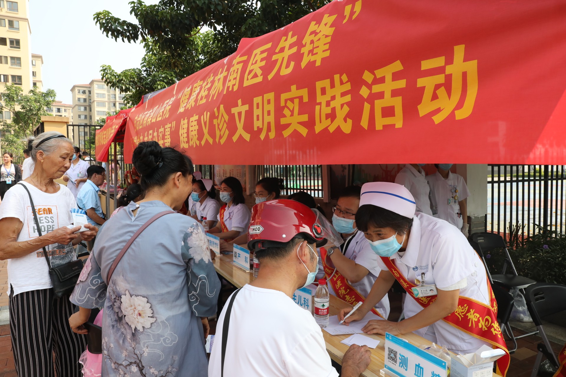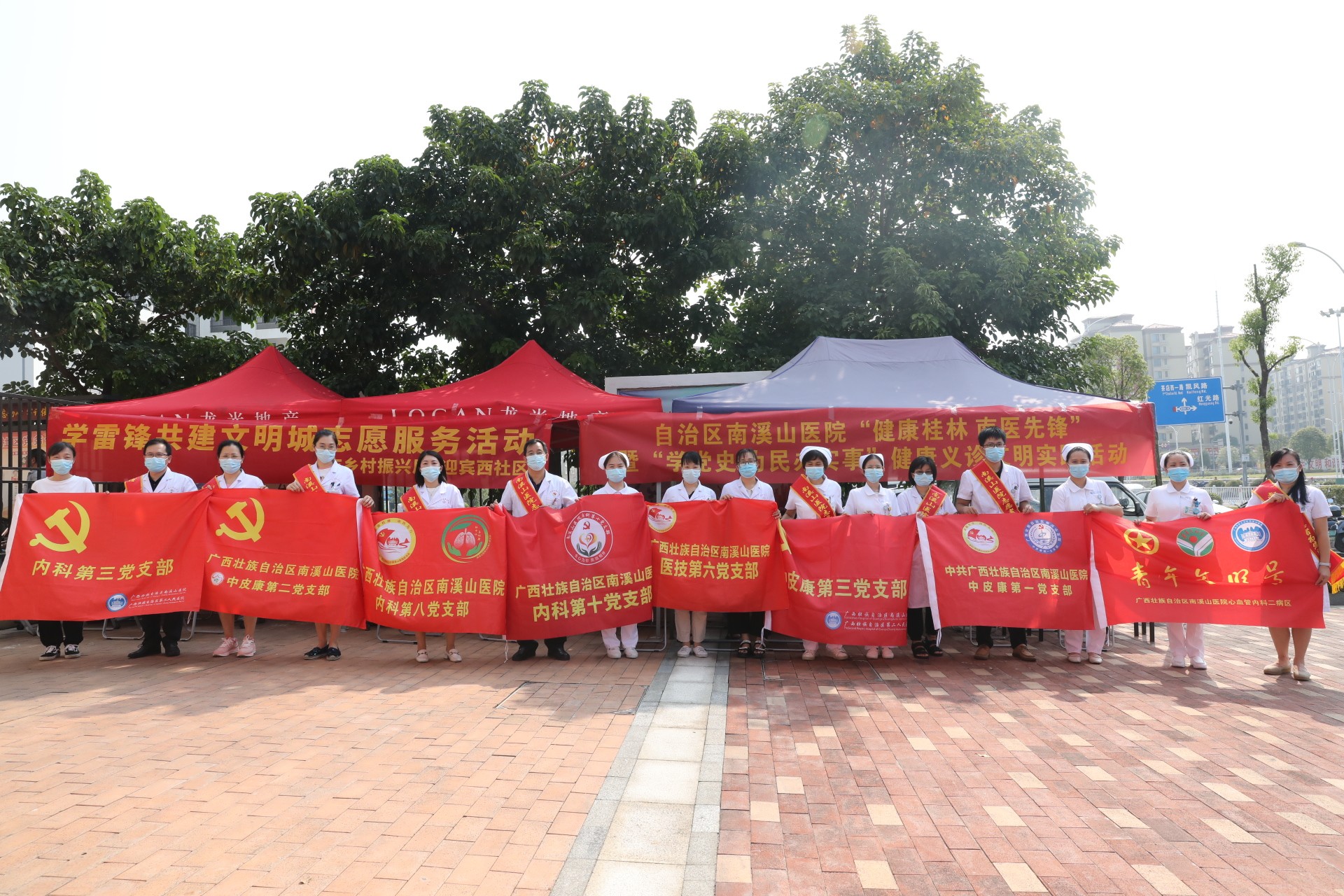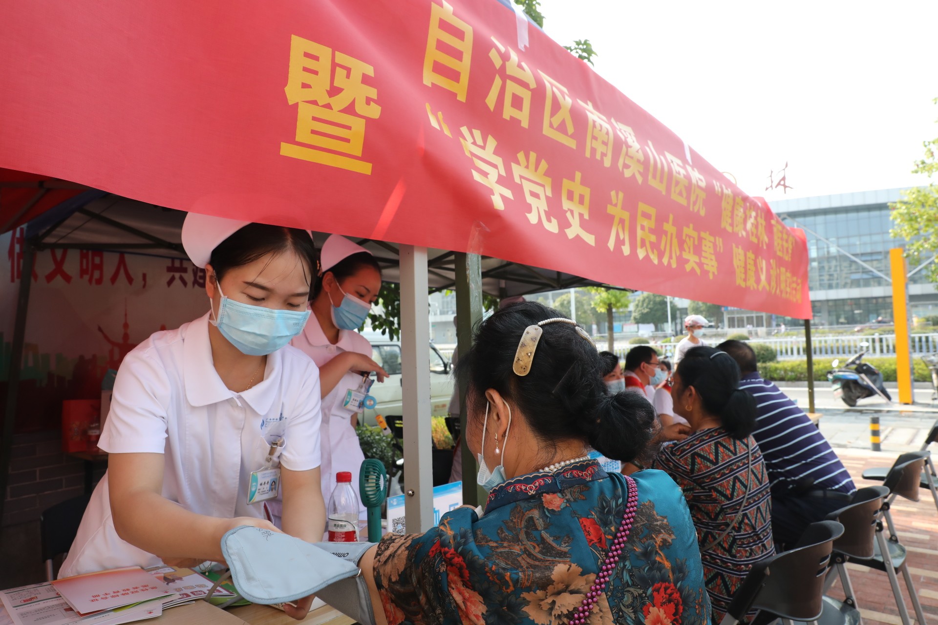 9月11日,广西壮族自治区南溪山医院组织多个党支部的医护人员到迎宾西社区进行义诊,送医送药,开展以“学雷锋志愿服务”为主题的新时代文明实践活动。