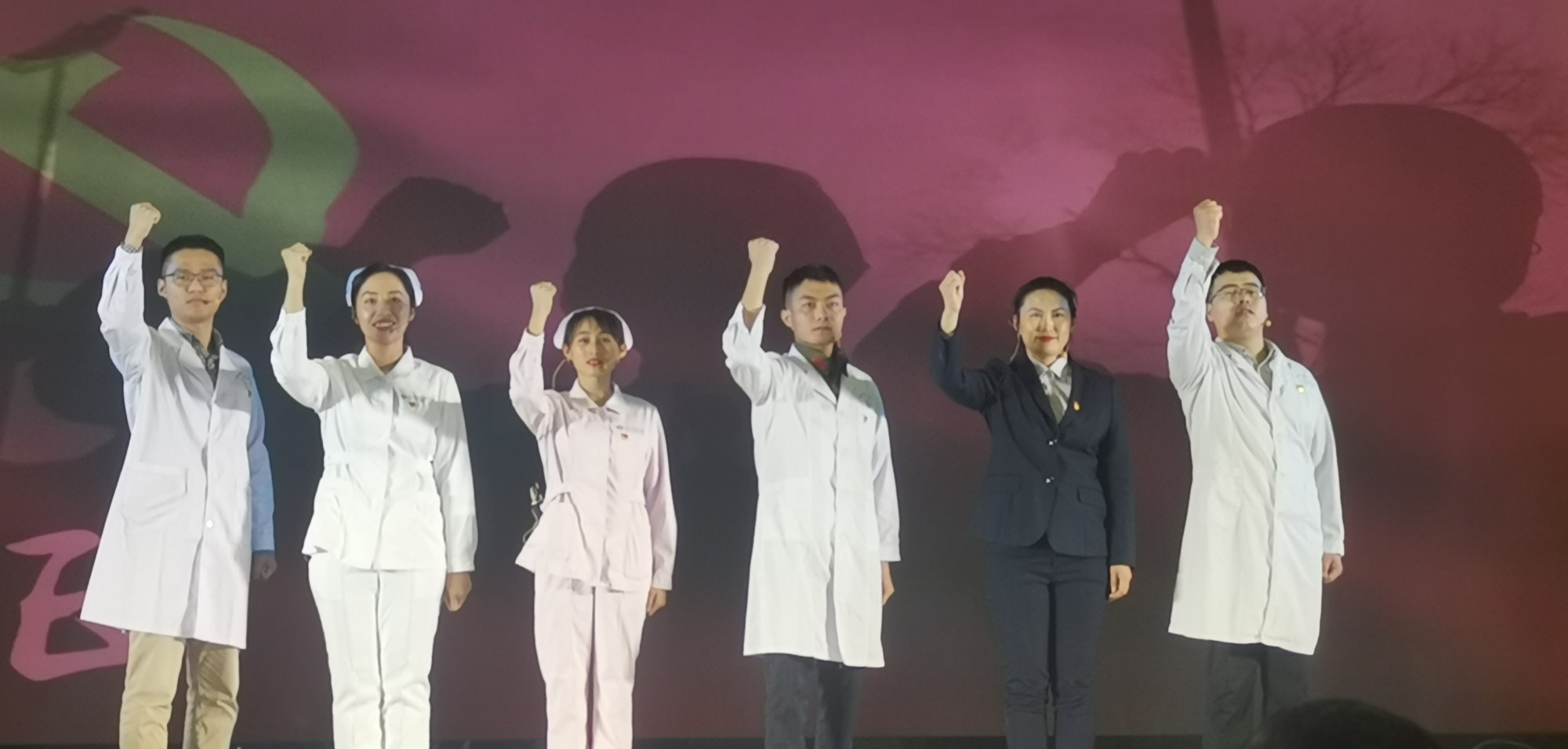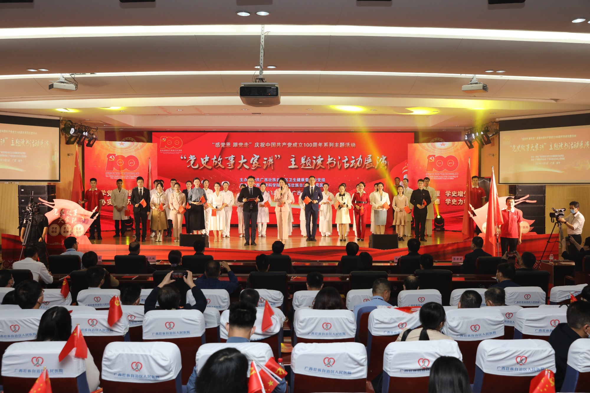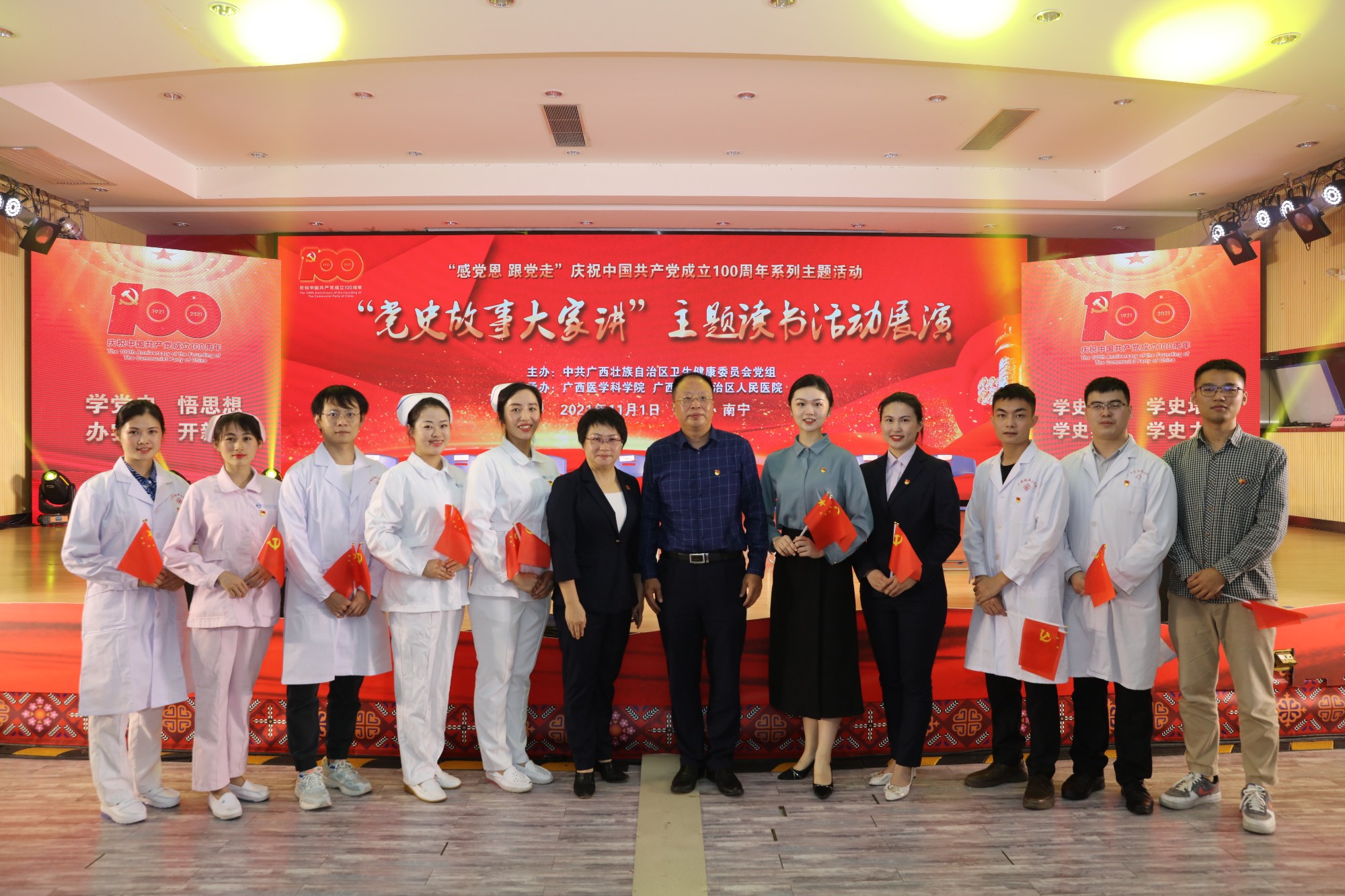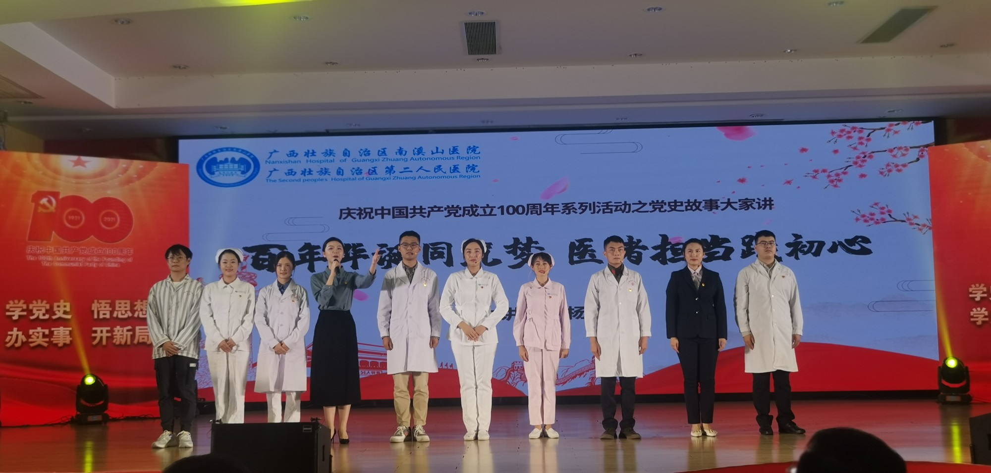 据悉,为进一步巩固党史学习教育成果,突出共产党员在医院发展历程中发挥的先锋模范作用和无私奉献精神,讲好南溪山医院的“党史故事”,医院党委从8月下旬就开始认真筹备此次展演,鼓励广大职工积极参与其中。最终由医院职工独立创作的《百年华诞同铸梦 医者担当见初心》从30个参赛作品中脱颖而出,取得了三等奖的好成绩,并受邀赴南宁参加展演。
