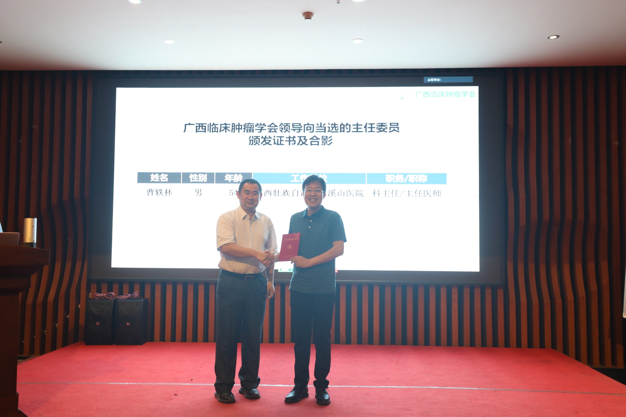 广西临床肿瘤学会会长胡晓桦为曹轶林教授颁发聘书