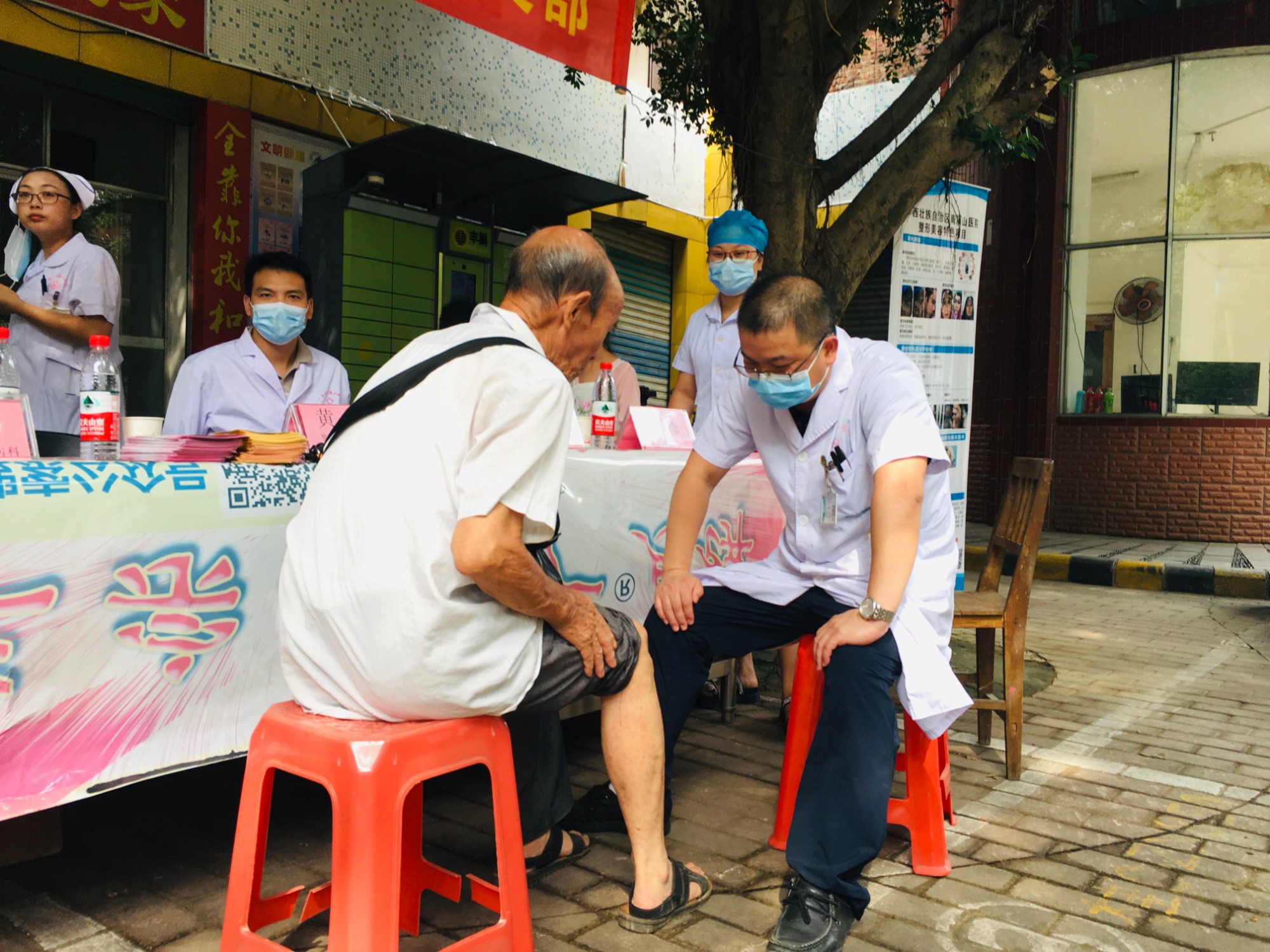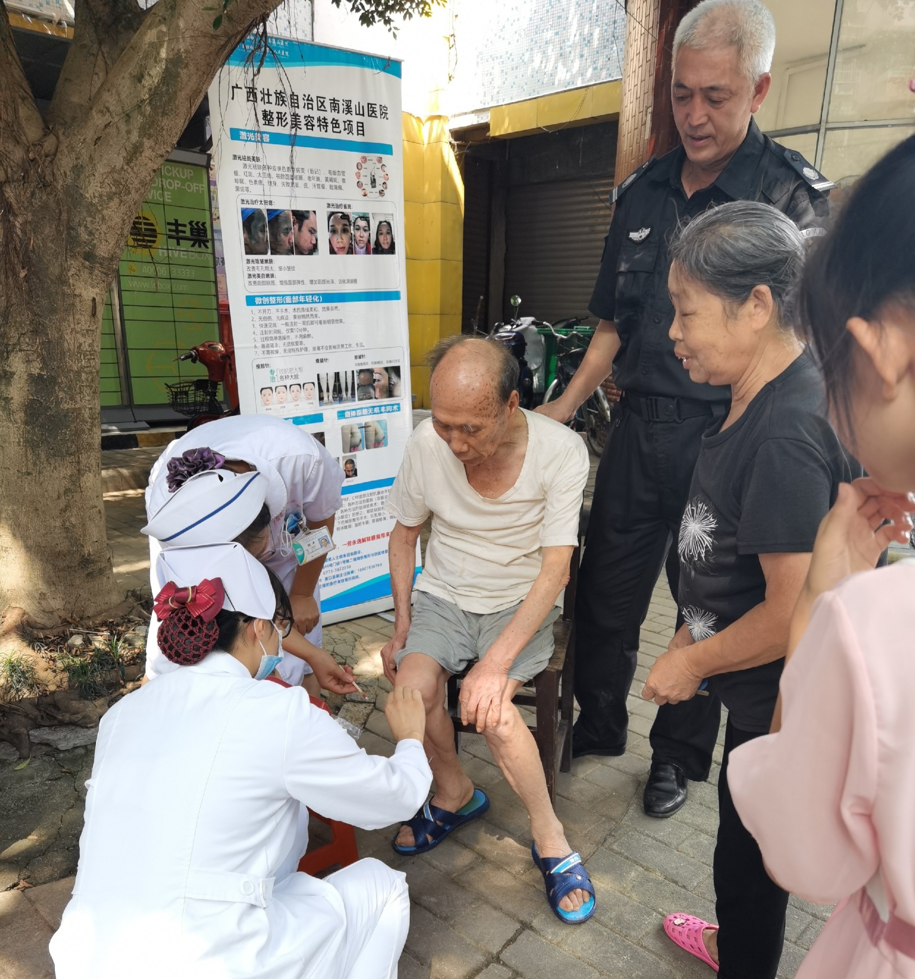 在义诊的过程中,,81岁高龄的吴大爷因为有脑中风基础病,行动不太方便,听说有医护人员在小区进行义诊活动,平时很少下楼活动的他,坚持前往咨询,在家属的搀扶下下了楼,可是就要在快到的时候,一不小心摔了一跤,还好并无大碍,只是轻微皮外擦伤,义诊的护士给他做了简单的清创处理,医生也对他的病情做了解答,他对医护人员的贴心服务称赞不已。