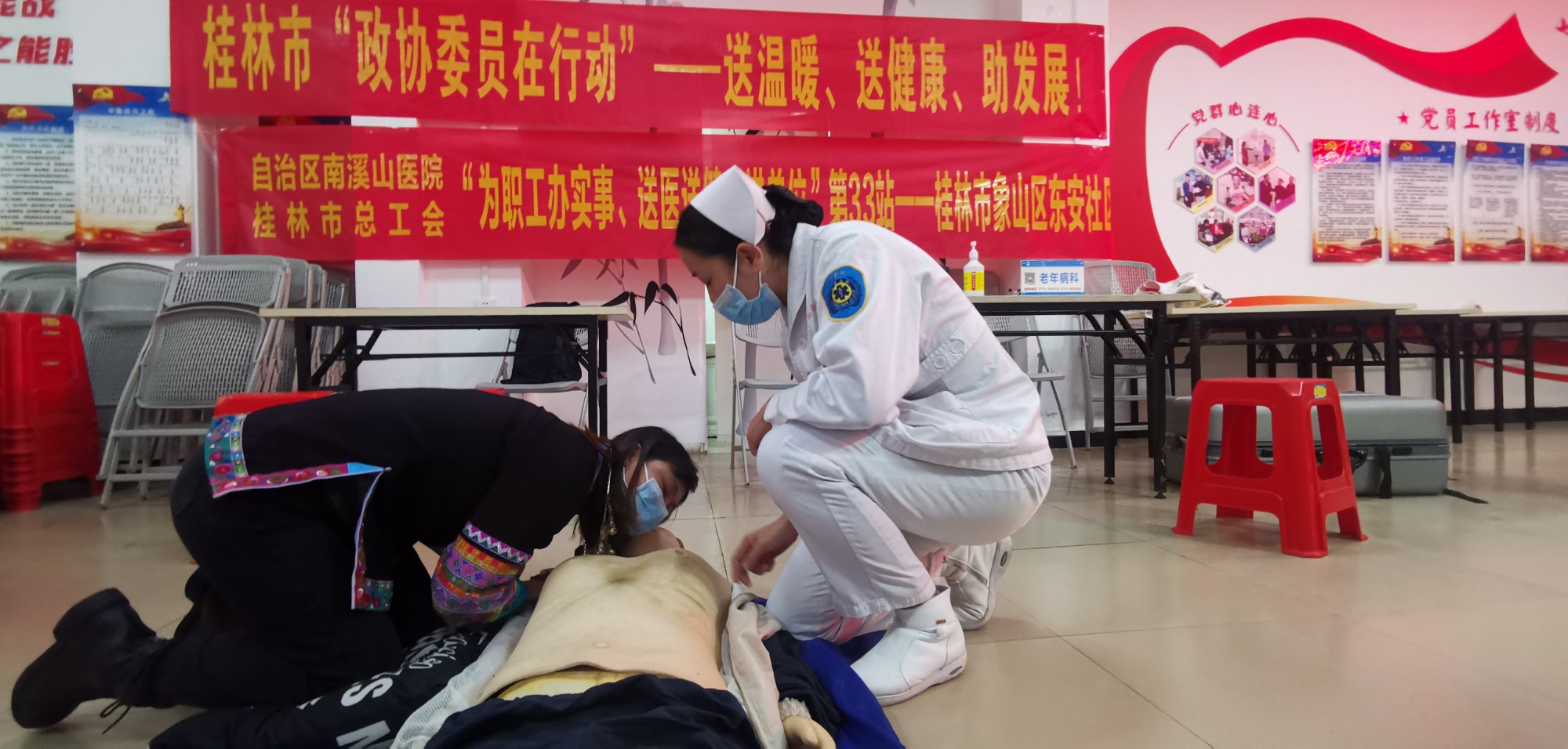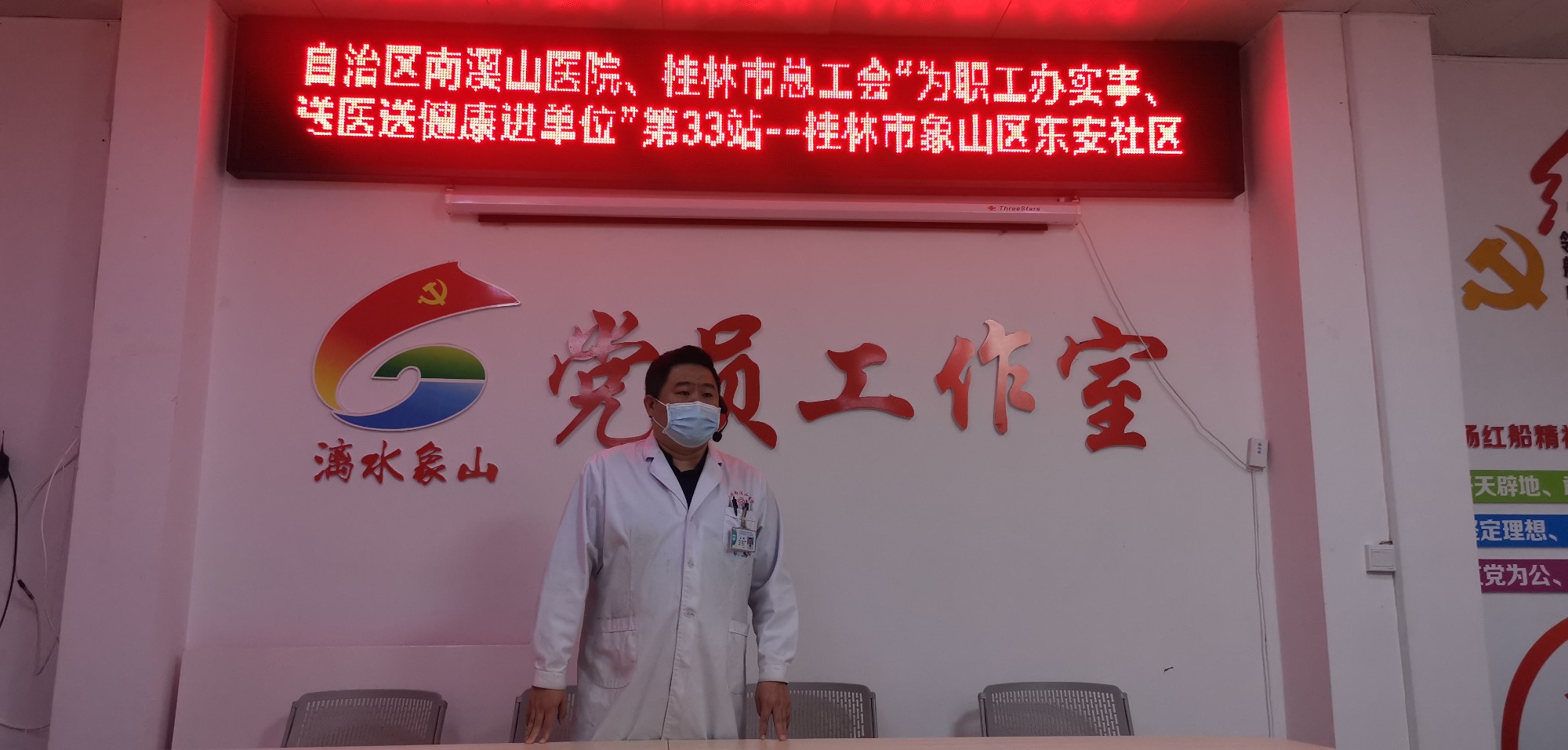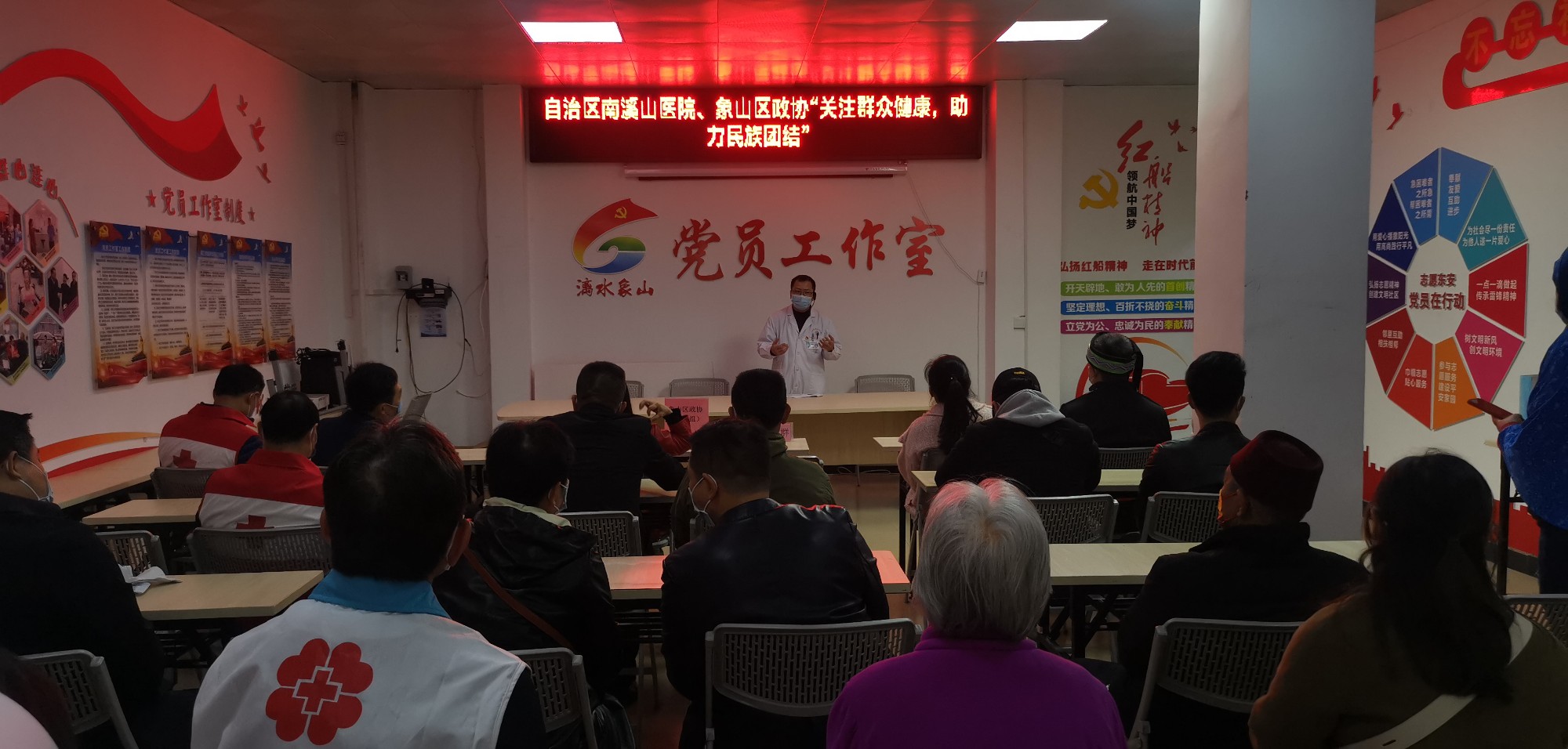 为迎接“壮族三月三”节日的到来,让各族群众度过一个健康平安的佳节,促进民族团结一家亲。4月1日,应桂林市象山政协和象山南门街道办事处东安社区的邀请,广西壮族自治区南溪山医院派出急诊科、老年病科专家,来到东安社区服务中心,为小区内各民族群众代表送上一份特殊的节日礼物-------新冠疫情防控知识和急救常识的讲座培训。这次活动也是南溪山医院、桂林市总工会联合开展的“学党史为职工办实事,送医送健康进单位”系列活动的第33站,也是桂林市“政协委员在行动——送温暖、送健康、促发展”活动的第10站。