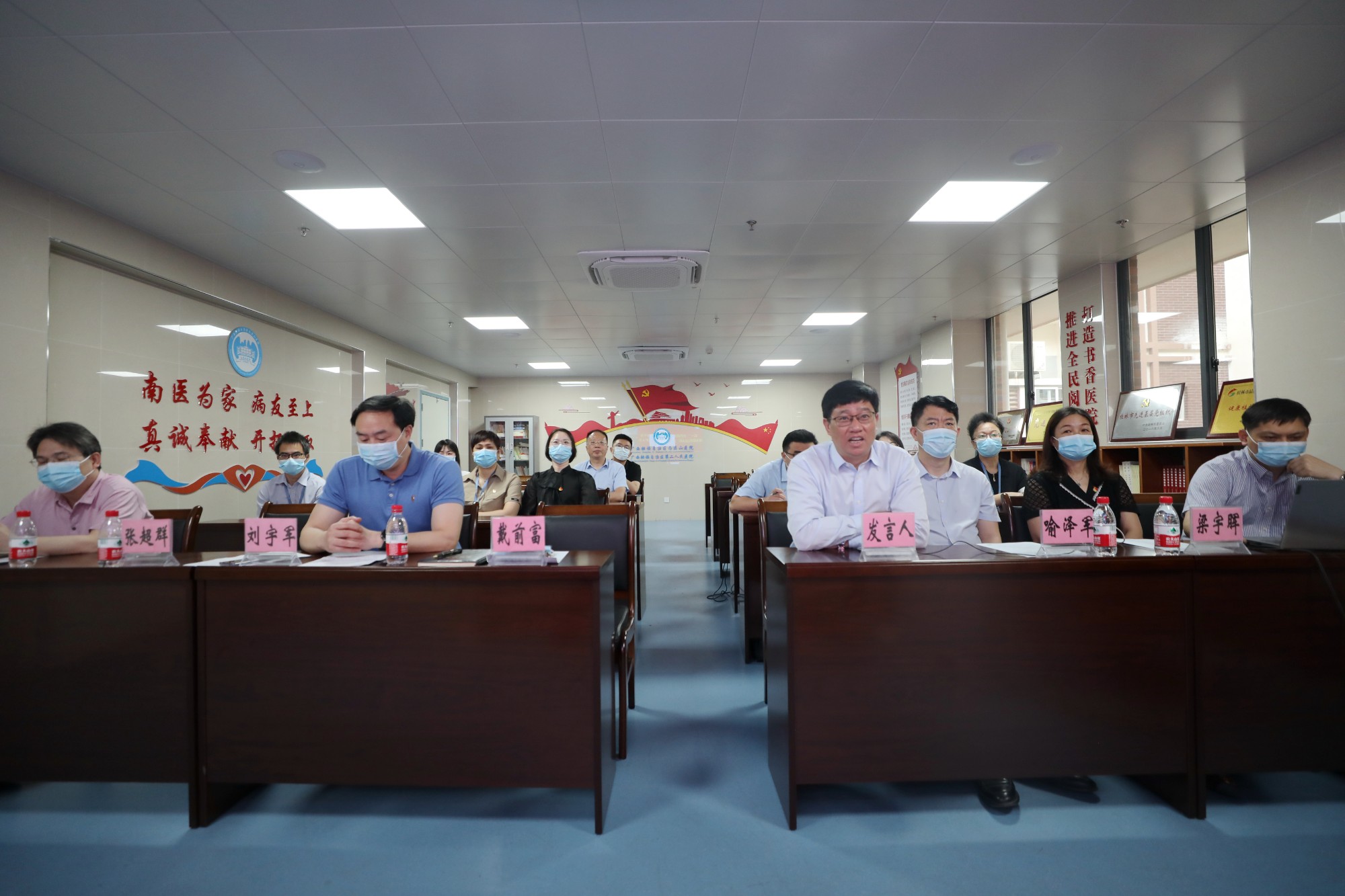 疫情防控医疗队总领队、南溪山医院副院长李朝旭代表医疗队员们进行发言,身在一线,他真实体验到抗疫工作的艰辛,队员们吃亏在前的辛勤付出彰显了大爱担当的南医精神,党员们冲锋在前的使命感更坚定了大家战胜困难的决心,他们将继续密切配合,攻坚克难,确保圆满完成支援任务。