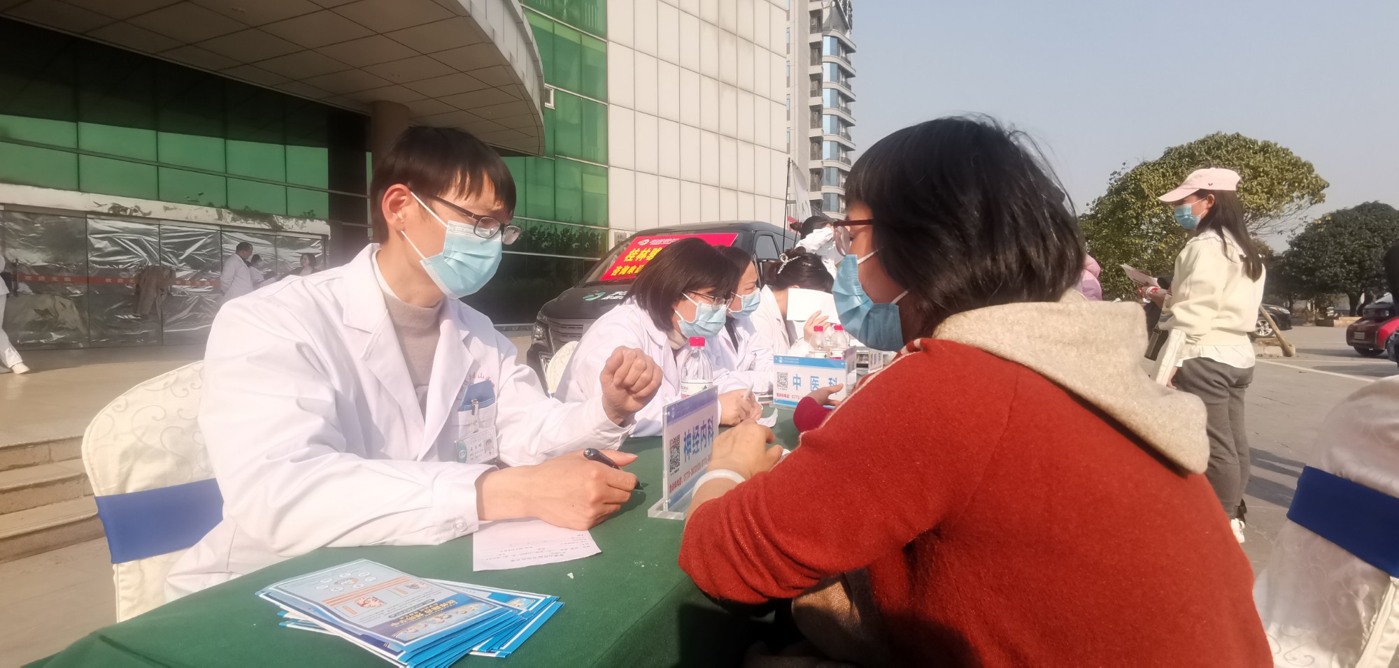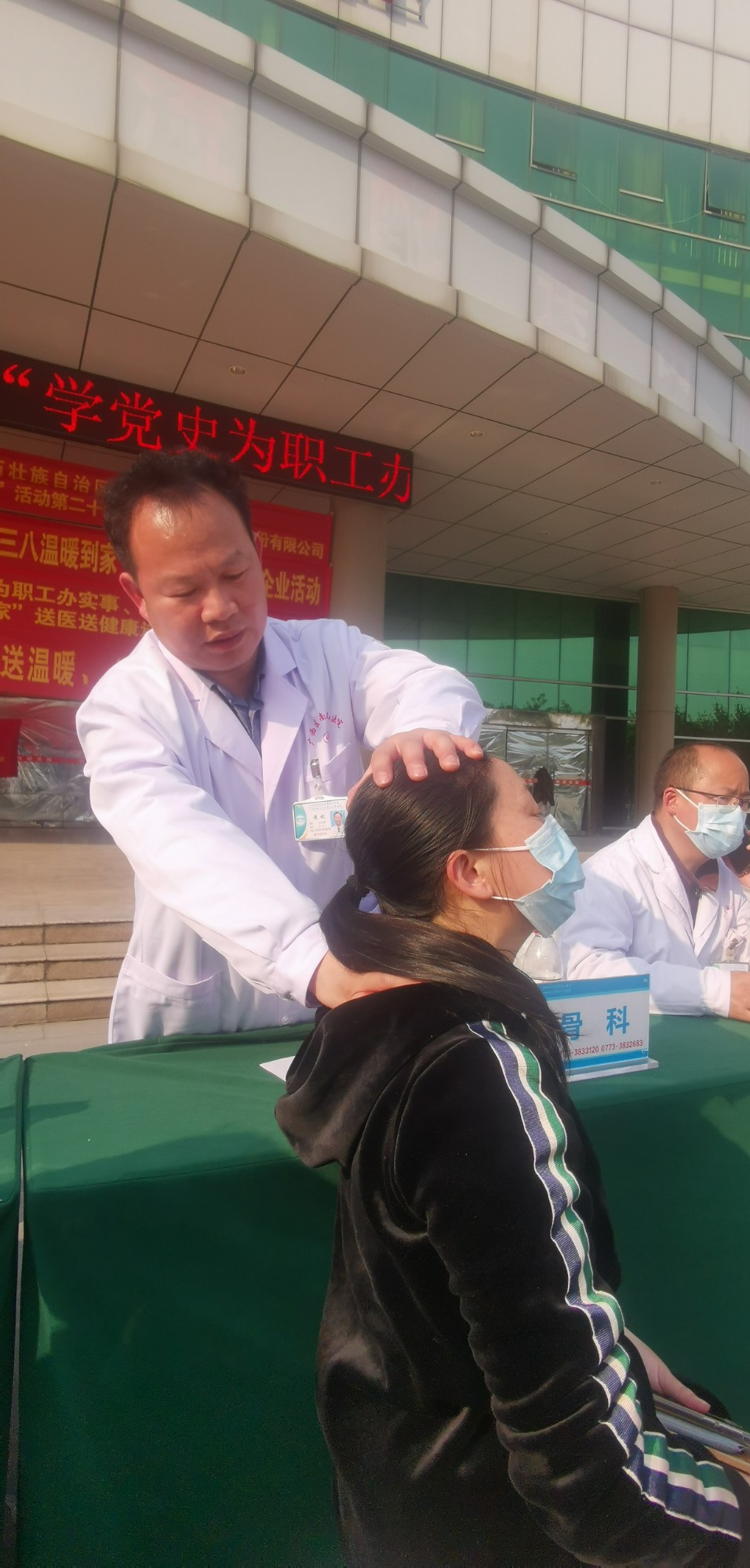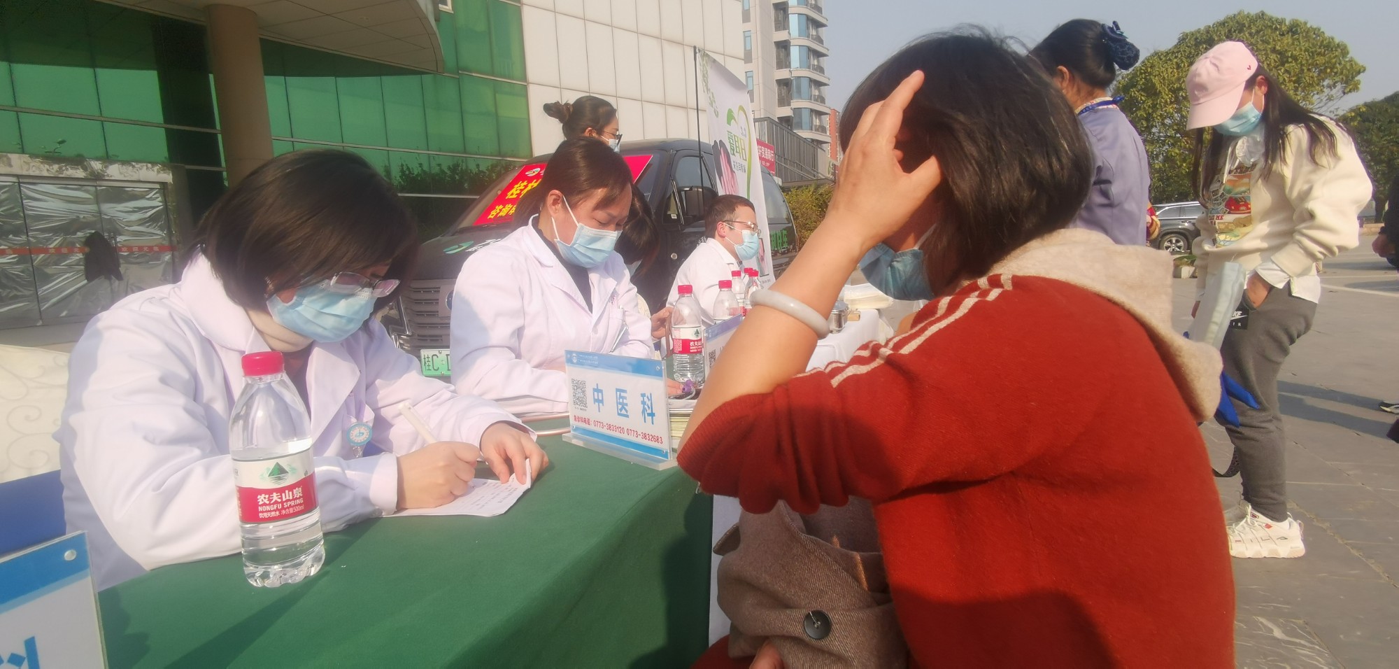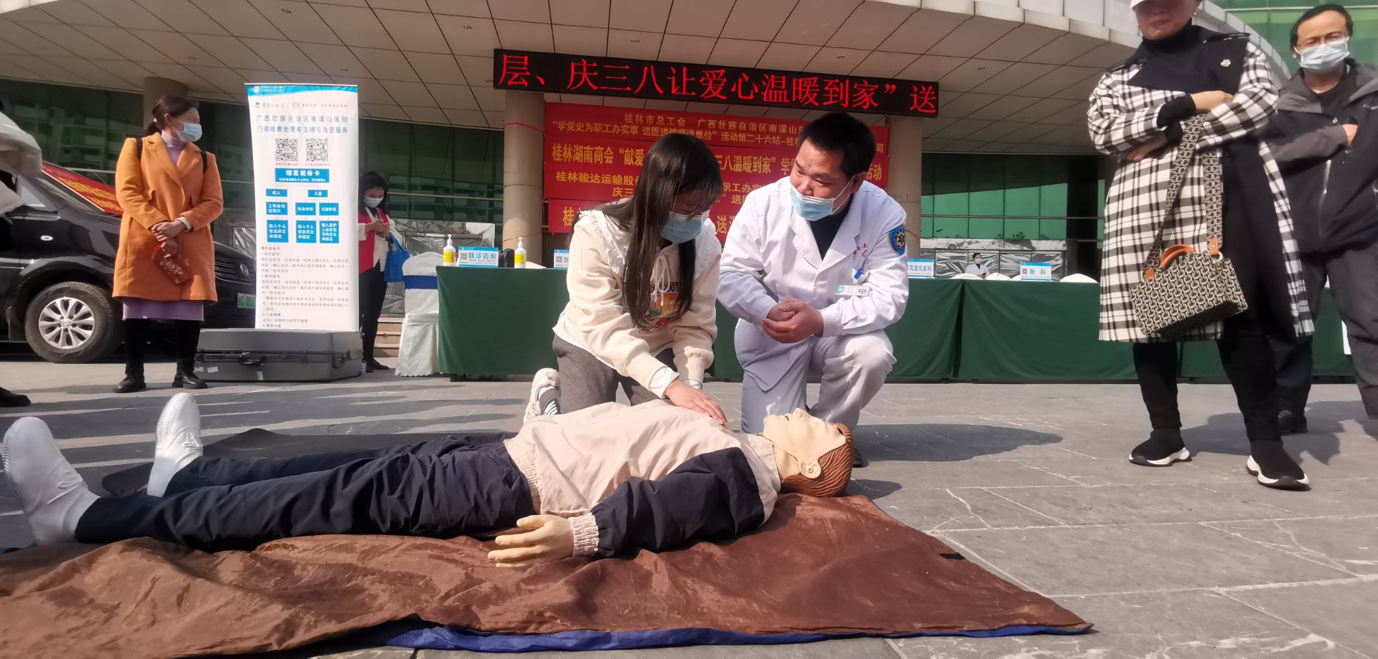 当天下午三点,送健康活动在桂林汽车北站前广场举行,简短的启动仪式后,首先由来自南溪山医院急诊科的医护人员对桂林骏达运输股份有限公司的职工进行徒手心肺复苏操作的讲解和培训,三名医护人员通过模型,边讲解、边操作,使大家很快就掌握了一些基本要领,培训结束,不少职工马上要求自己动手操练,现场气氛十分活跃。随后,来自医院风湿免疫科、关节外科与运动医学科、心脏大血管外科、血管外科、急诊科、中医科、眼科、儿科、泌尿外科、耳鼻喉科等科室的专家、医护人员各就各位,开始为桂林骏达运输股份有限公司的职工和来往的群众进行义诊。咨询、检查、诊断、治疗,医护人员头顶骄阳忙个不停,他们耐心解答大家提出种种健康问题,并现场接诊。对一些职工检查出的疾病隐患,及时给予治疗建议和方案。到场的职工中不少是女性,她们对自身健康很重视,不少人是看了一个专家又看另一个,直到得到满意结果。