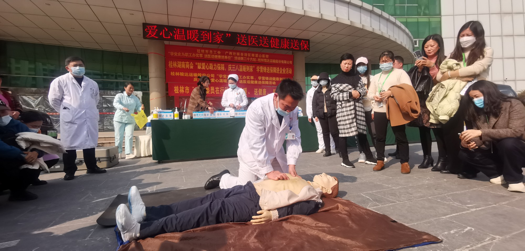 “今天南溪山医院组织这么多专家上门来给我们职工检查、体检、诊断疾病,真是雪中送炭。令人敬佩,令人感动,太感谢了!”3月2日,应桂林骏达运输股份有限公司工会的邀请,由广西壮族自治区南溪山医院、桂林市总工会联合开展的“学党史为职工办实事,送医送健康进单位”活动第26站走进桂林骏达运输股份有限公司,这场活动不仅是两个单位的党委、工会、团委学雷锋活动之一,也是骏达公司迎接“三八”节关爱妇女健康的一项活动。同时,这也是桂林市“政协委员在行动------送温暖、办实事、助发展”活动的第五场。来自南溪山医院近20多名党团员志愿者、医疗专家、医护人员,为该公司近百名一线职工提供了急救知识培训、健康保健知识咨询和医疗检查诊断、免费测量血压、血糖等医疗服务。桂林骏达运输股份有限公司工会主席、副总经理骆明助和该公司的干部职工,以及到场参加、指导活动开展的桂林市总工会宣教部部长彭正文,赞助支持此次活动开展的桂林湖南商会秘书长唐谟解等领导,对南溪山医院弘扬厚德精医、大爱担当的南医精神,坚持开展送健康到基层进单位,为一线职工群众办实事,用实际行动弘扬雷锋精神,助力健康桂林的行动高度评价,连连称赞。