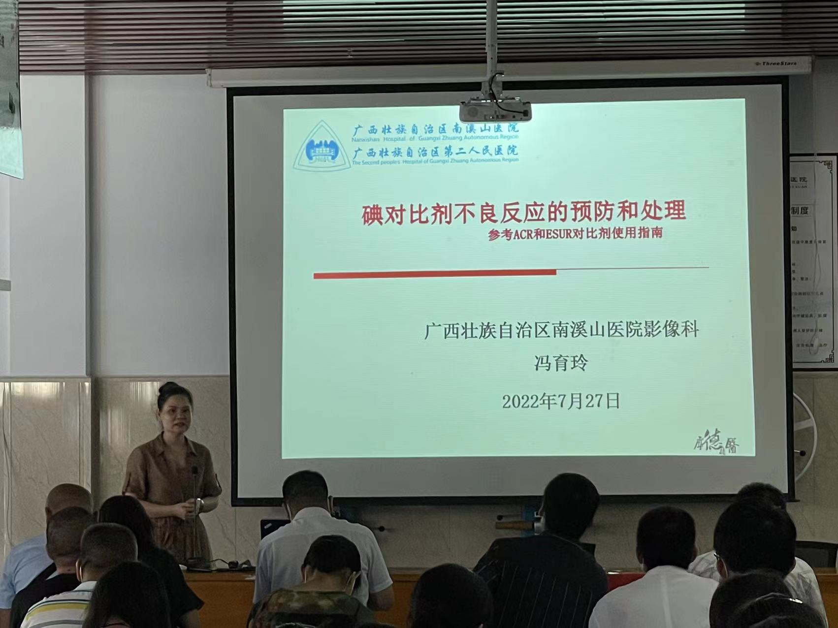 下午,覃小燕副主任为此次技术指导作了题目为《多层螺旋CT增强及血管成像技术的临床应用》的讲座,冯育玲护士长作了题目为《碘对比剂不良反应的预防和处理》的讲座。通过近两个小时深入浅出、生动形象的讲课,临床科室及专科人员对CT机的临床应用价值和血管成像技术的意义有了新的认识,都希望能尽早开展起这项技术。