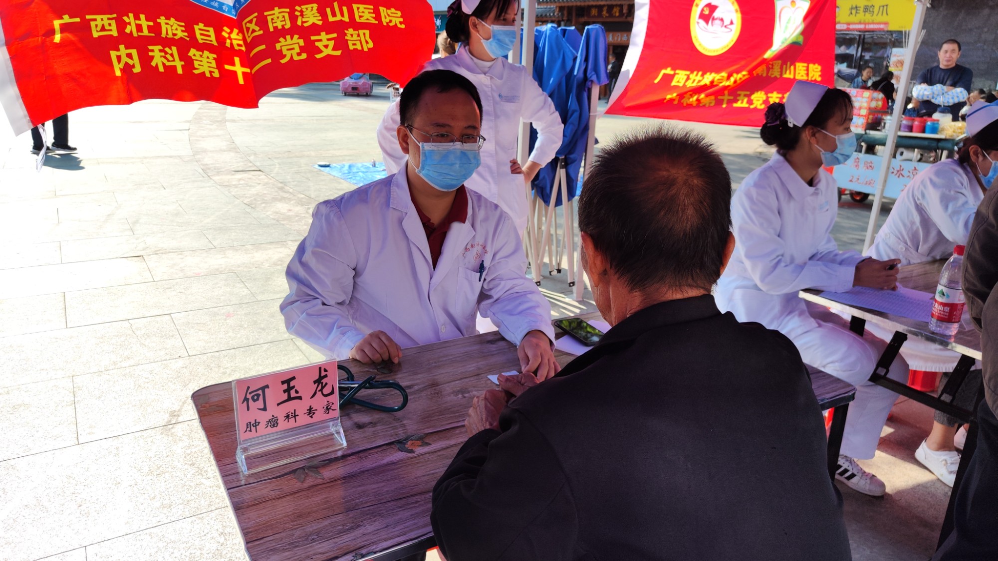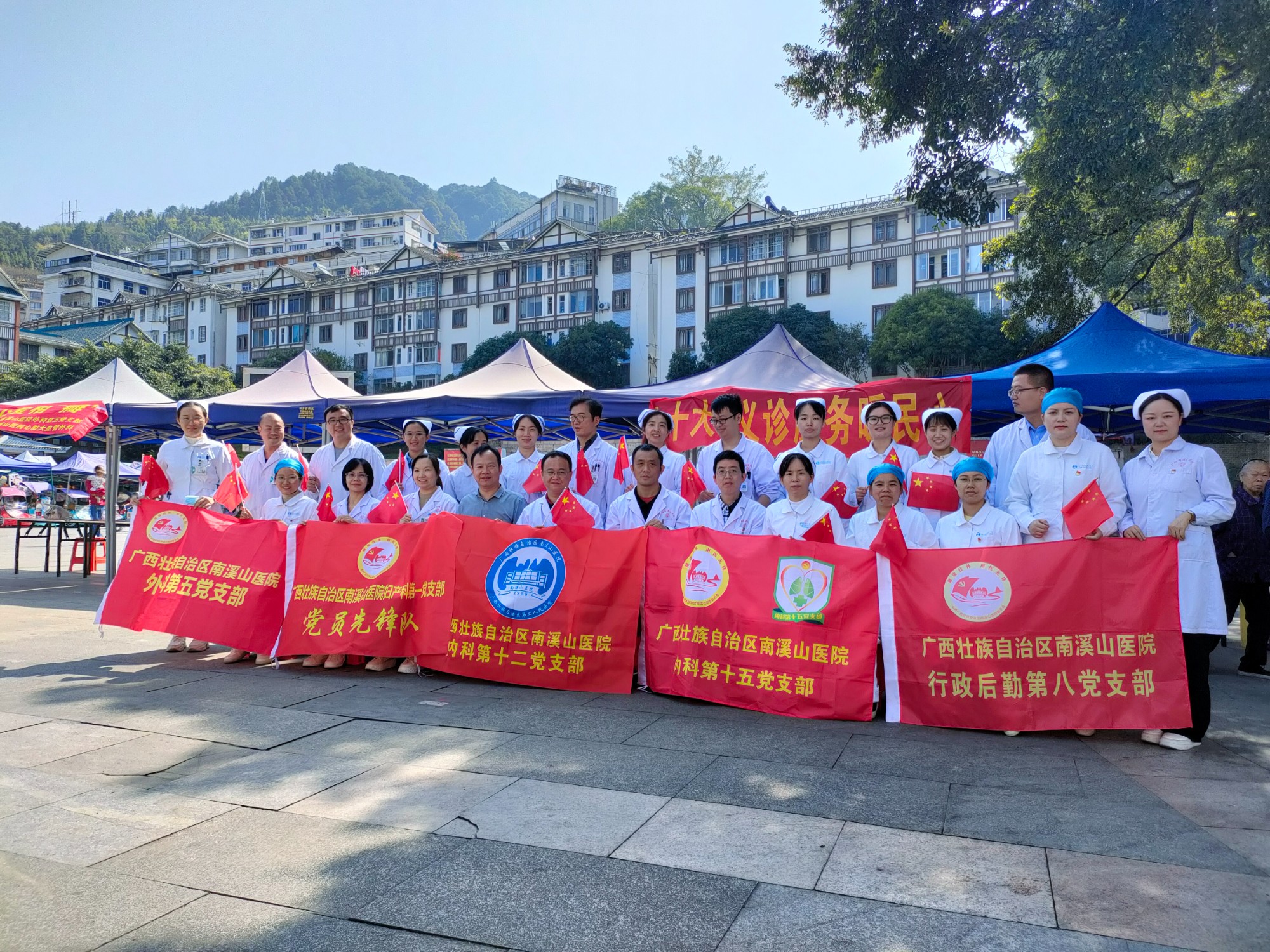 10月29日,广西壮族自治区南溪山医院外科第一、第四、第五党支部和妇产科第一党支部、内科第十二、十五党支部以及行政后勤第八党支部联合开展“同心共庆二十大 义诊服务暖人心”主题党日活动,以实际行动服务基层群众,庆祝党的二十大胜利召开。