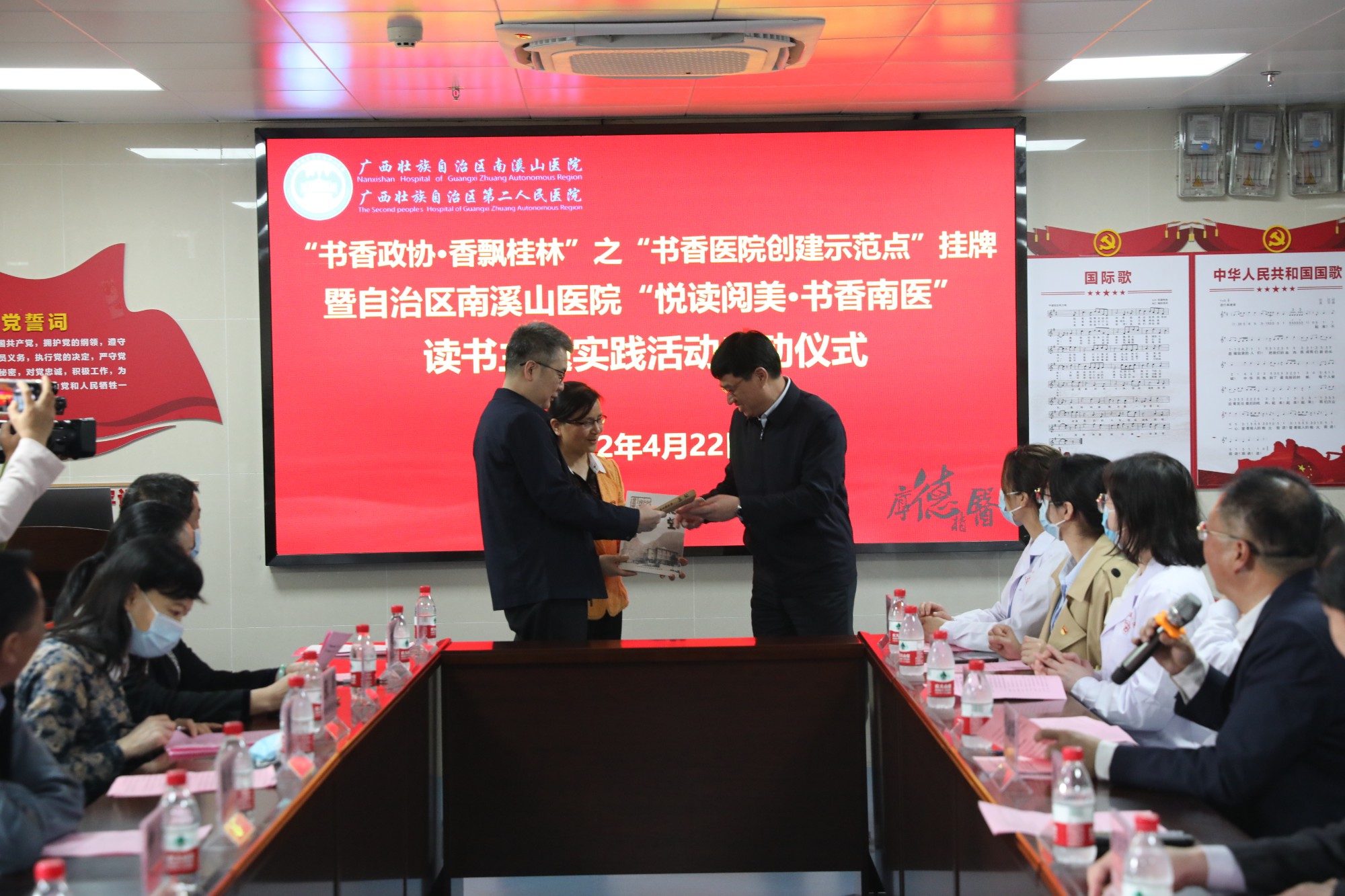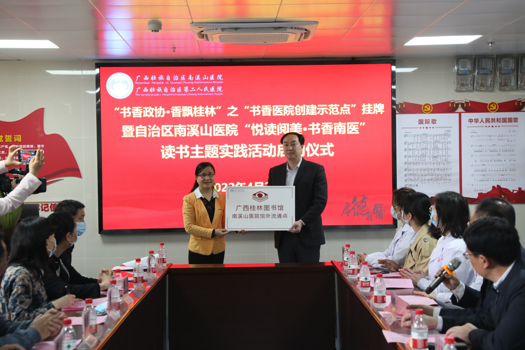 4月22日,第27个“世界读书日”到来之际,桂林市政协、广西桂林图书馆、桂林市新华书店、南溪山医院联合举办启动仪式,为“书香政协 香飘桂林”系列活动在桂林市打造的首个“书香医院创建示范点”揭牌,同时向广西桂林图书馆南溪山医院馆外流通点授牌,正式启动“悦读阅美 书香南医”读书主题实践活动。