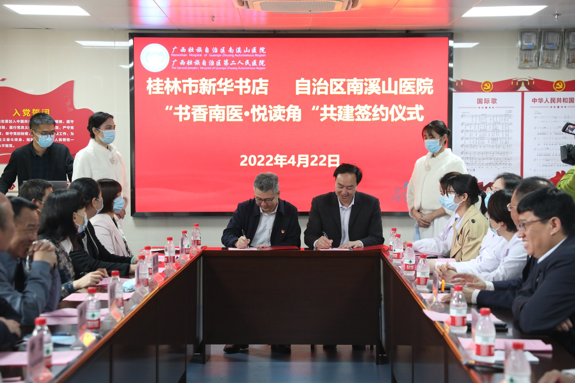 座谈结束后,黄继军与刘宇军代表双方签订了《桂林市新华书店有限公司与广西壮族自治区南溪山医院设立“书香南医”阅读点共建协议》;钟琼与戴前富代表双方签订了《广西桂林图书馆、广西壮族自治区南溪山医院党建融合发展协议》,并为南溪山医院馆外流通点授牌。戴前富向广西桂林图书馆、桂林市新华书店赠送了医院党建、文化建设系列丛书。据悉,广西桂林图书馆和桂林新华书店向南溪山医院免费赠送图书700余册,内容涉及医疗健康、养生保健、励志故事等方面。
