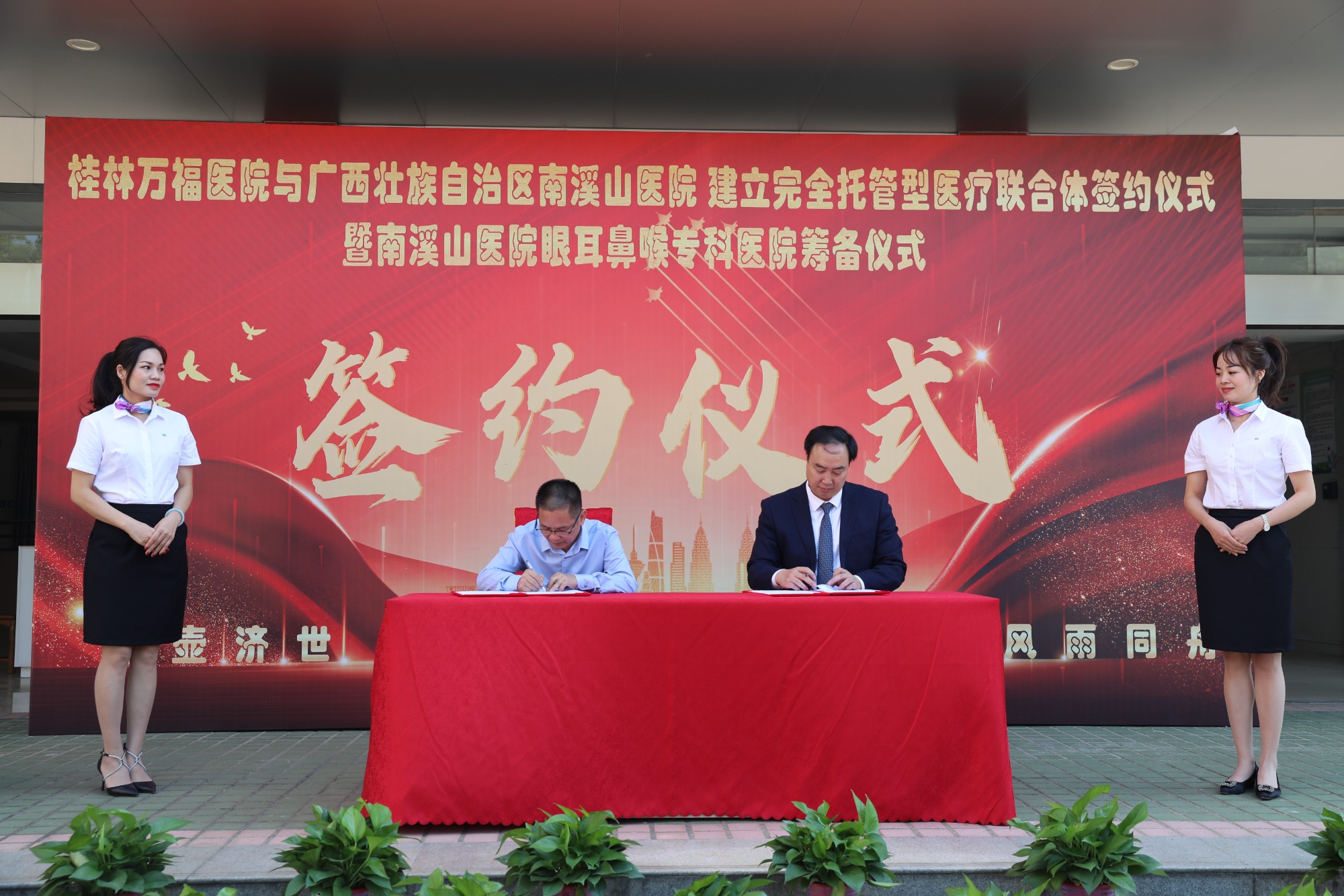 10月18日,广西壮族自治区南溪山医院与桂林万福医院建立完全托管型医疗联合体签约仪式暨南溪山医院眼耳鼻喉专科医院筹备仪式隆重举行,南溪山医院与桂林万福医院医疗联合体正式成立。