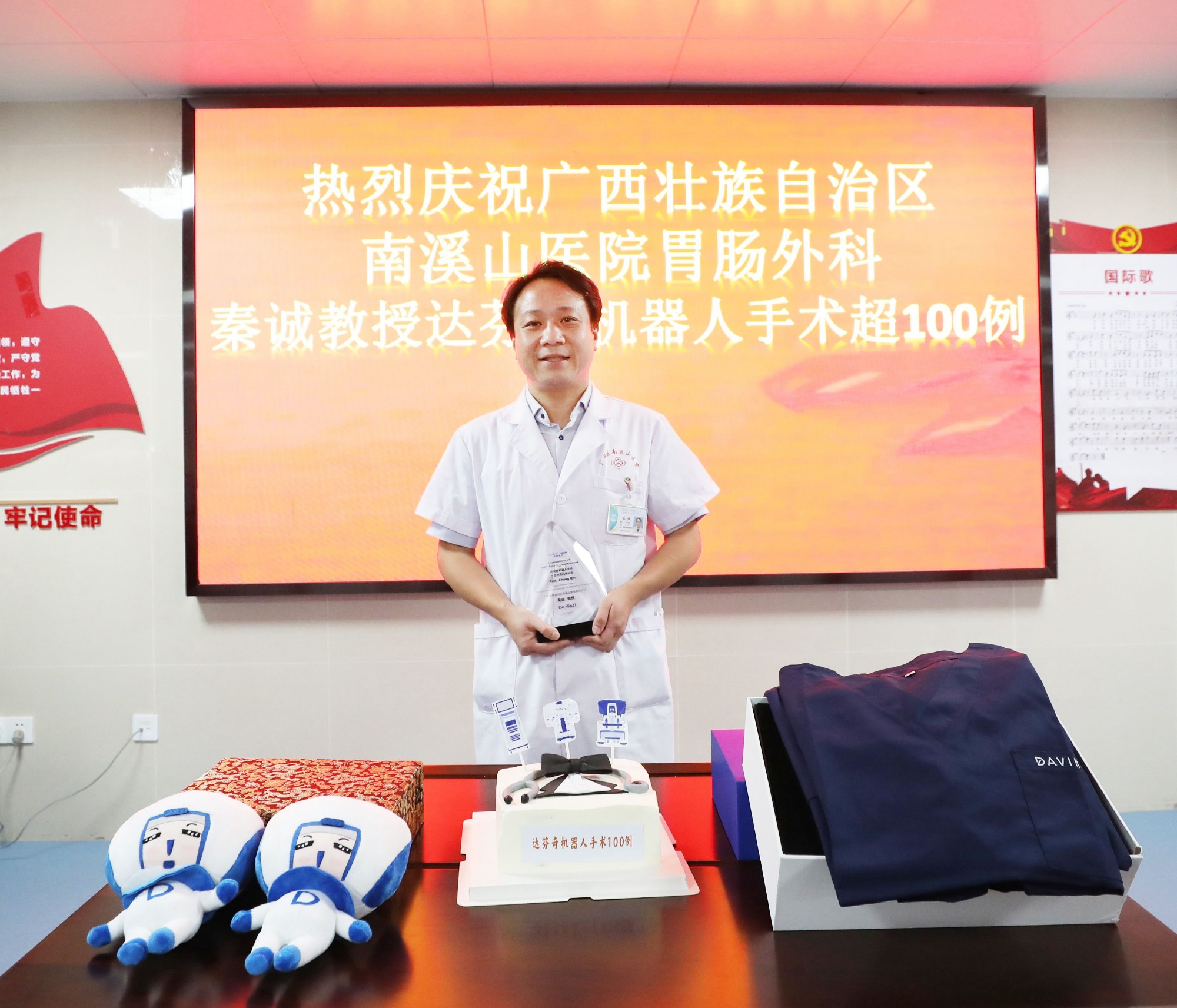 秦诚主任手捧广西首个达芬奇机器人胃肠道手术100例纪念碑