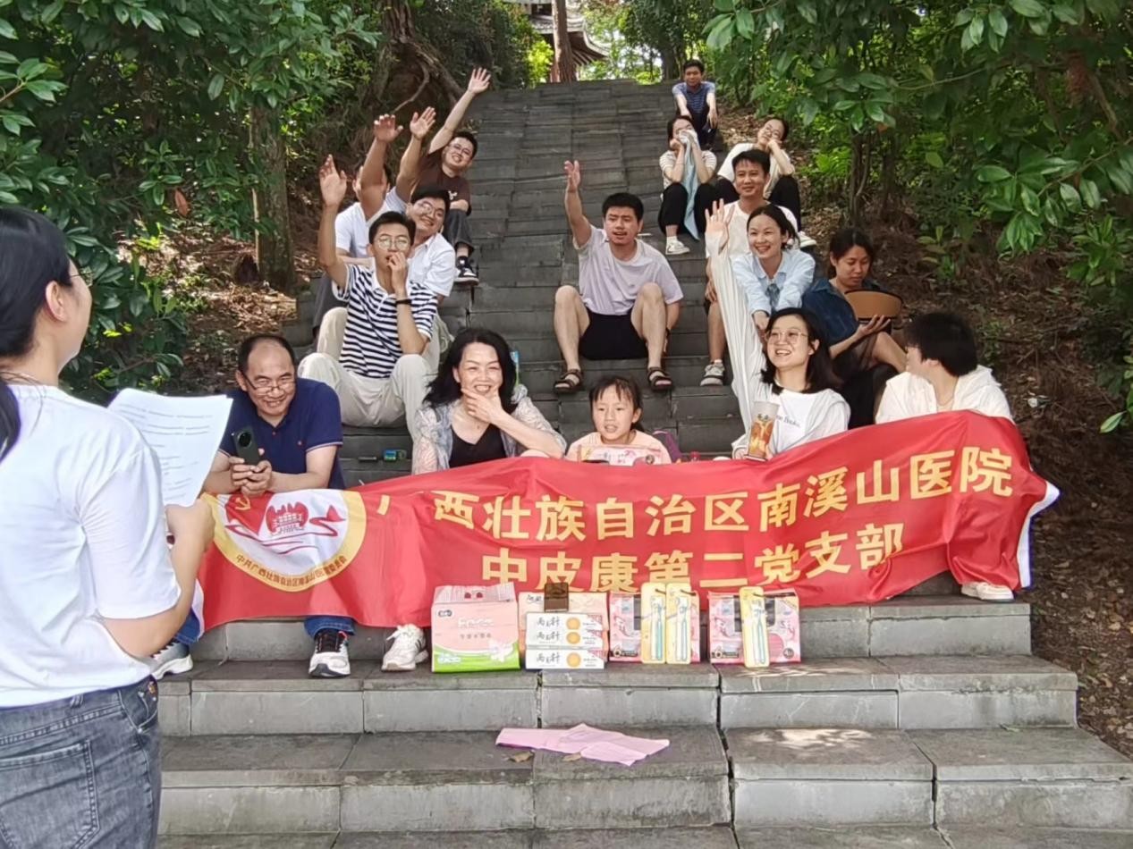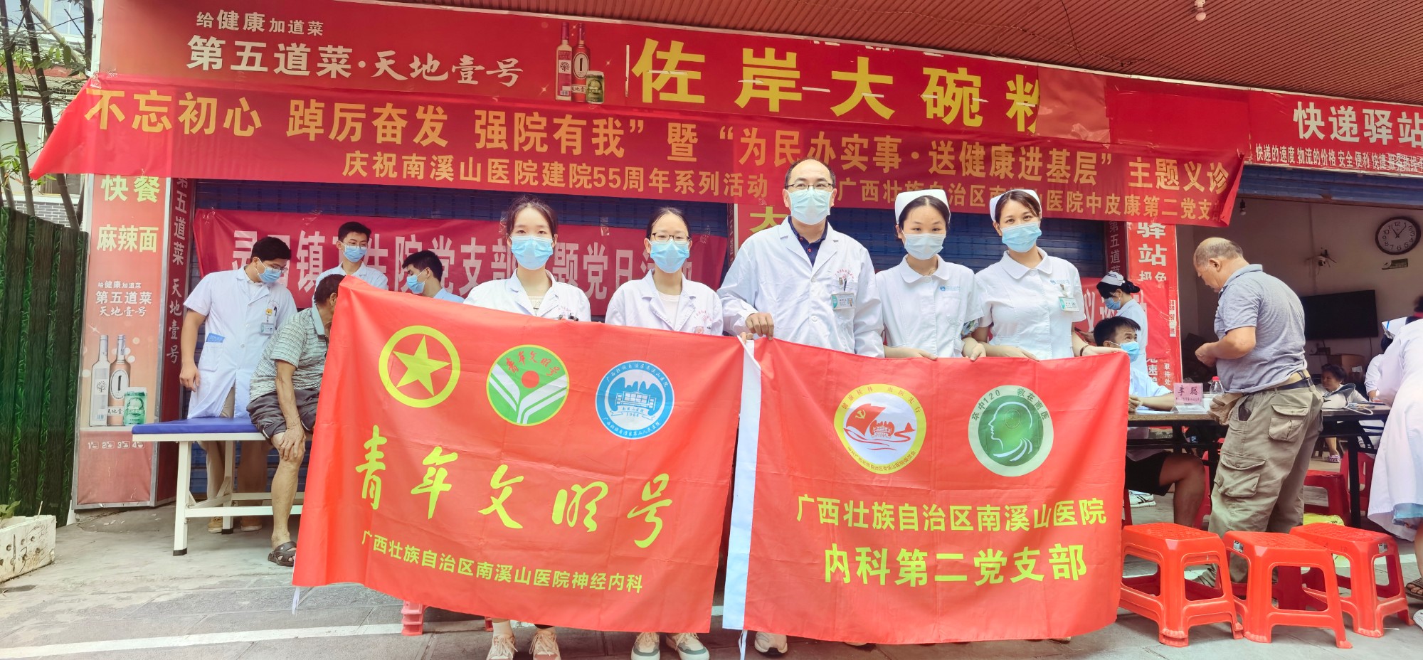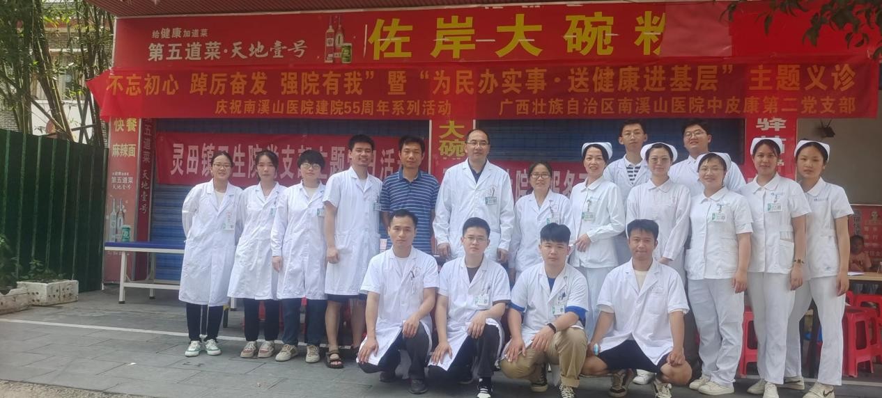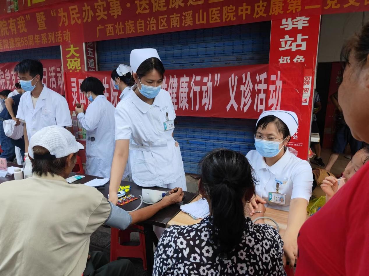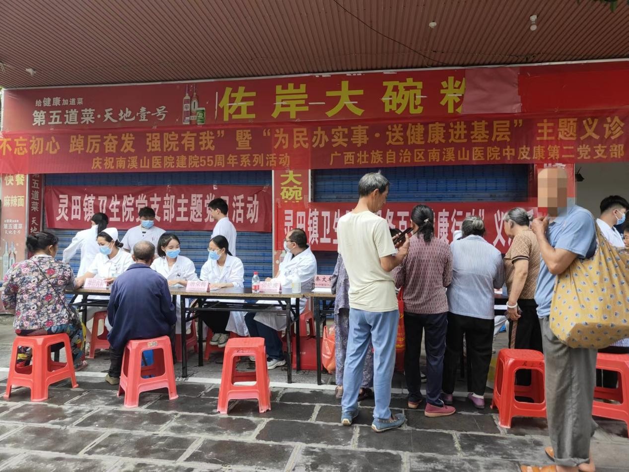7月1日,广西壮族自治区南溪山医院中皮康第二党支部及内科第二党支部联合灵川县灵田镇卫生院党支部在灵田镇开展免费义诊活动。