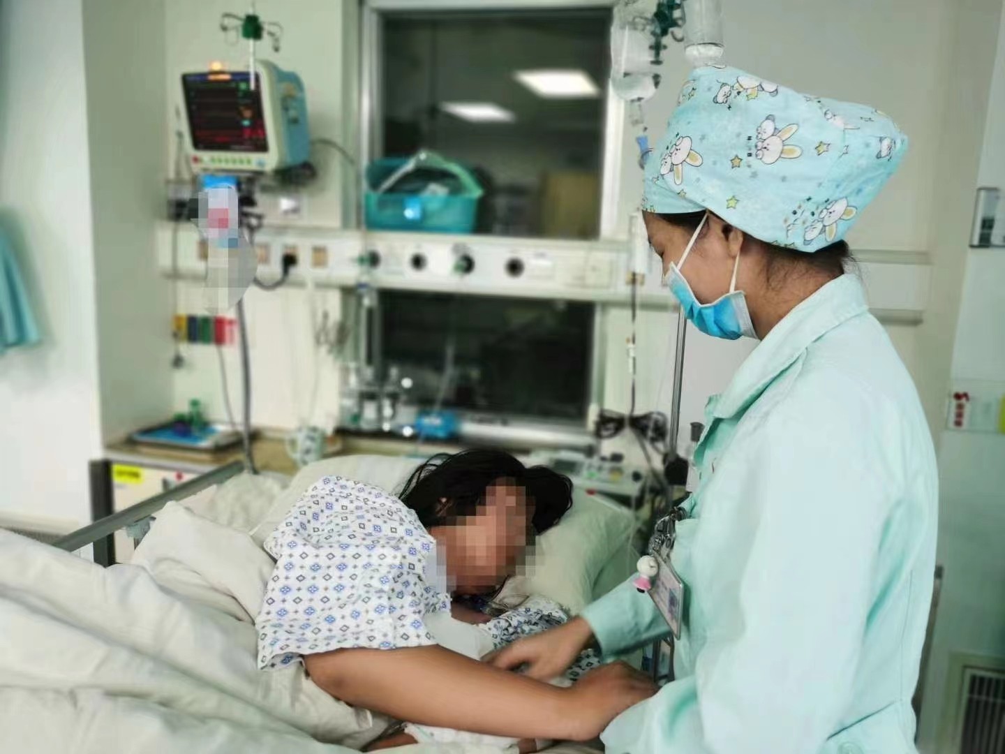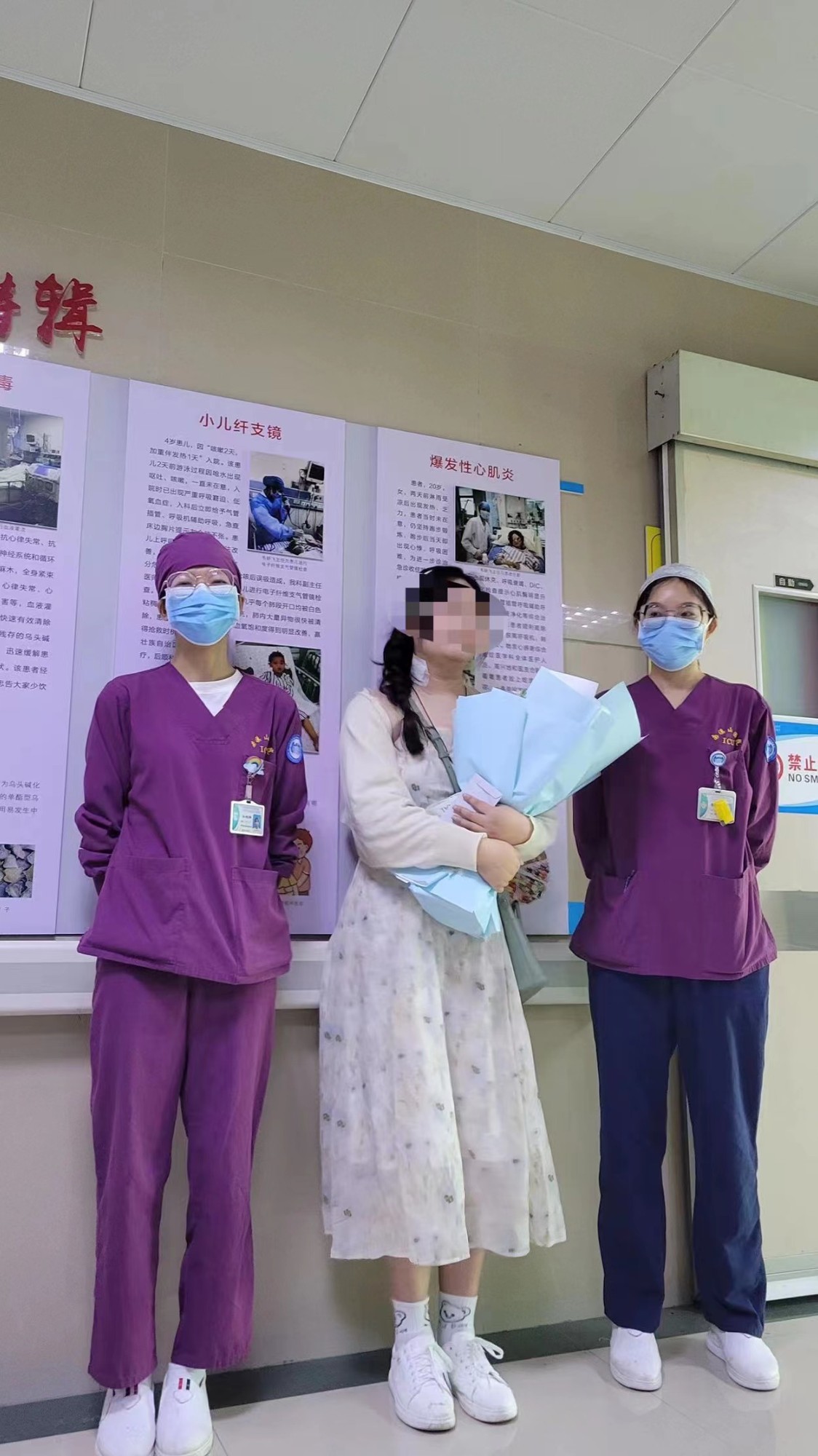 不久后,随着治疗的不断深入,小姑娘的身体状态也逐渐好转,终于迎来了拔气管插管的时机。拔管的当天晚上,小姑娘跟管床护士江旭柳说睡不着,精神焦虑、怕自己睡着醒不来,对于刚进ICU刚满一年的小江来说,知道患者此时最需要什么,随后她说到:不怕,小江姐姐给你抓着手睡,直到你睡着为止,一直陪着你,经过相互的交流,慢慢地增进彼此之间的感情,握着江旭柳的手就这样在交流中逐渐睡去。亲切的陪伴与细心的照顾,使得小姑娘很快就康复出院了。出院的前一天坐着轮椅,她带了两束鲜花来到了ICU门口,其中就有一束送给了江旭柳护士。