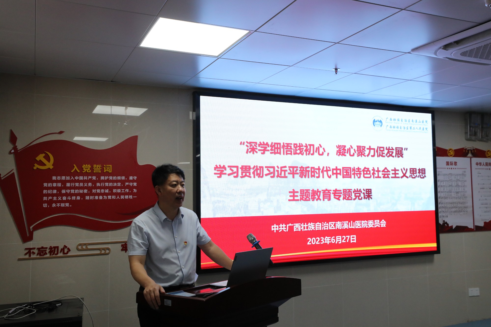 为深入开展学习贯彻习近平新时代中国特色社会主义思想主题教育,6月27日,广西壮族自治区南溪山医院纪委书记喻泽军以“深学细悟践初心,凝心聚力促发展”为题,为医院行政后勤第三党支部、行政后勤第八党支部、内科第八党支部、外科第八党支部、外科第十党支部、医技第八党支部等党支部的党员医务工作者上了一堂立意深远、思想深刻的专题党课。