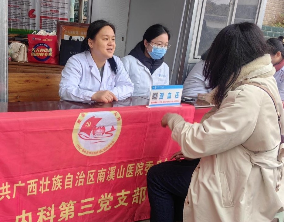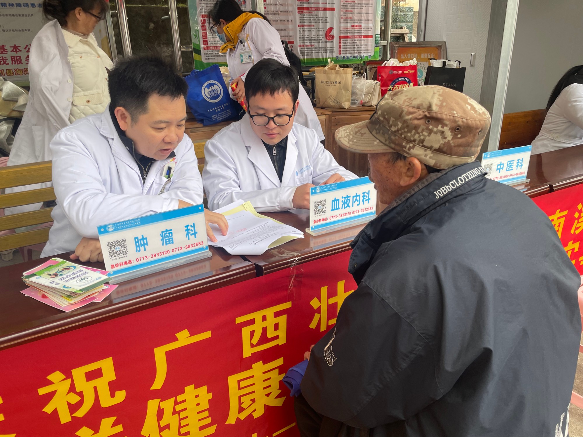 12月2日,广西壮族自治区南溪山医院内科第十一、第九、第七、第三党支部,中皮康第一党支部,医技第二、三党支部联合开展“送医送健康,我为群众办实事”义诊活动,来自肿瘤科、内分泌、血液科、中医科、检验科、超声医学科的党员医务人员前往灵川县海洋乡卫生院为当地50余名群众提供免费的医疗服务和健康咨询。