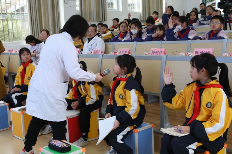 针对师生们重点关注的一些问题,南溪山医院健康宣讲团队分别进行了学生健康讲座和教师健康讲座,眼科副主任文美丹、儿科医生李娟、感染性疾病科副主任李庆辉先后进行了《保护眼睛,预防近视》讲座、《甲流如何防治》讲座和《小学生预防肺结核》讲座,以通俗易懂,生动有趣的上课方式向学生们传授近视防控及传染病防控等健康知识,现场学生们积极踊跃的回答问题并认真做好笔记。“眼睛是心灵的窗户大家都应该保护好自己的眼睛,必须要有一个正确的读写姿势,保持良好的生活习惯,要均衡饮食,多吃蔬菜水果、少吃甜食,要多做有效的户外活动,远离电子产品。”来自四年级一班的王智炜在听完预防近视讲座后说道。