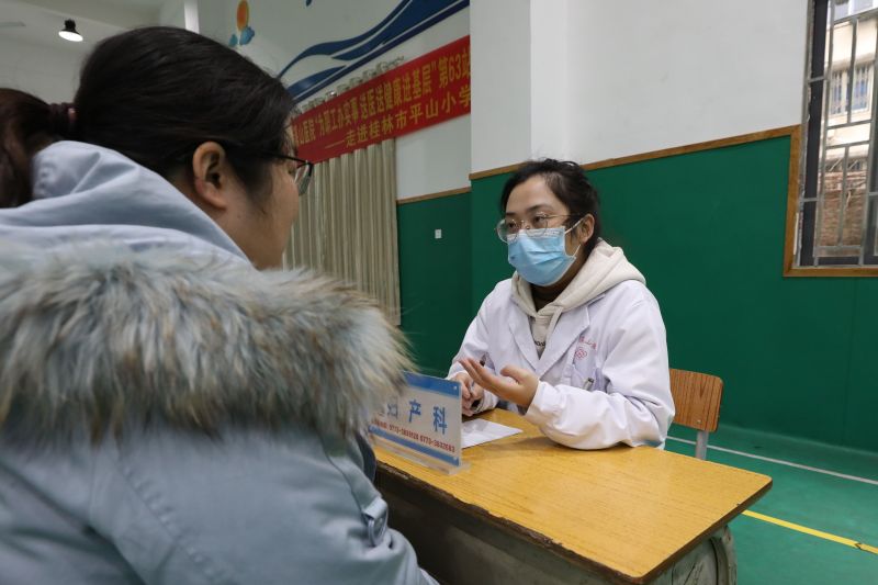 健康讲座结束后,南溪山医院送健康专家团队还为桂林市平山小学的师生们针对儿科疾病、甲状腺乳腺疾病、五官系统疾病、女性疾病、骨科系统、医学美容问题等进行义诊活动和健康管理咨询,讲解常见病的预防知识和注意事项,开展免费检测血压、血糖和指脉氧免费测量等服务。专家们耐心细致地解答师生们日常生活中遇到的各类医疗保健问题,并针对不同病症和个体差异提出合理的诊疗建议和治疗方案。在近一个小时的义诊活动中,前往咨询的师生们络绎不绝。“老师,您的血压有点高,要适当运动、控制体重,多吃些蔬菜和含糖低的水果。”医务工作者们耐心的就各种常见疾病等进行答疑解惑,指出不良生活习惯可能导致的疾病危害,并从膳食营养、运动作息上给予健康指导,提醒大家在工作、学习中应注意劳逸结合,养成健康的生活方式及行为习惯。义诊过程中专家们热情的态度,优质的服务,熟练的技术得到了前来问诊的师生们一致好评。
