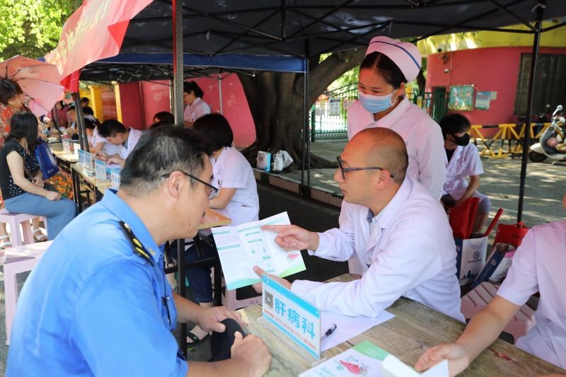 活动当天正值“世界肝炎日”。感染性疾病科副主任李庆辉和科室医护人员在义诊现场,为群众讲解病毒性肝炎诊治和预防措施,发放宣传手册。李庆辉表示,肝炎的最大危害是会悄无声息地发展成肝硬化、肝癌、肝衰竭等严重疾病,脂肪肝、“乙肝小三阳”等常见疾病都需要高度重视。而预防肝炎关键在于早发现、早诊断,广泛开展义诊有助于提高基层群众对肝炎等疾病的重视度,更规范地进行疾病治疗。