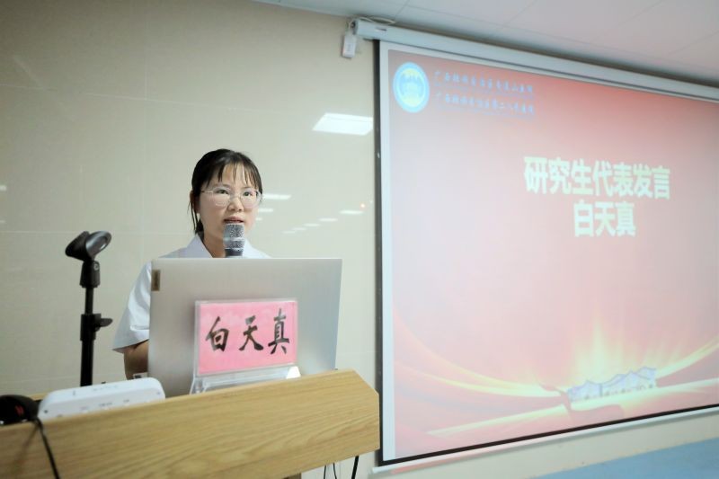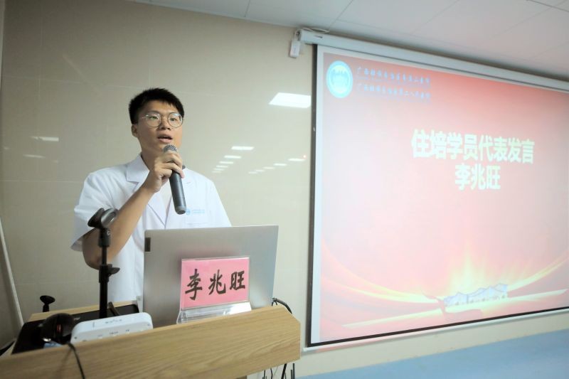 典礼上,该院综合重症医学科专业基地主任韦妍飞作为指导老师代表发言,2023级内科住培学员李兆旺和麻醉科专硕白天真分别作为学员代表发言。随后,医院领导为新学员代表授予听诊器。