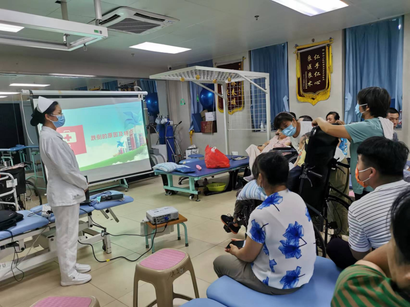 康复医学科跌倒小组组长李雪梅护士通过现场宣讲、床旁沟通等多种方式,围绕影响患者安全的各类因素、预防措施和对症处置,向患者们生动讲解了”防跌倒“、“防坠床”等方面的相关知识;与此同时,管道小组组长秦梅林还向患者和家属们详细讲解各种管道的作用、重点内容、护理要求、注意事项等护理知识,并手把手教患者和家属如何做好气切管道、尿管、胃管等管道的日常护理工作。