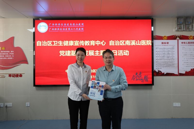 南溪山医院党委书记柳宏林向自治区卫生健康宣教中心赠送了医院丛书《战疫新闻集》、《战疫图册》等,并详细介绍了医院党建、宣传等工作的基本情况。他希望南溪山医院与宣教中心在媒体深度融合的发展背景下,扩大宣传及健康科普工作的传播力、引导力及公信力,探索并实践传播新形式,不断向外界展示广西卫生健康系统良好形象,讲好南医故事。