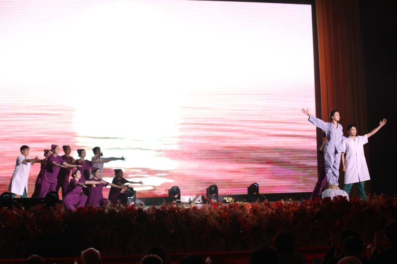 院史讲述、京剧表演、广西文场、诗朗诵、场景歌舞、大合唱轮番上演……演出主要由医院新老职工和医联体成员单位联合演绎,展现了南医人爱岗敬业、艰苦奋斗、救死扶伤、乐于奉献的精神风貌。每一个节目都深深表达了对医院建院55周年的祝福,一幕幕精彩的表演将现场气氛一次次推向高潮,让到场的越南客人、院外嘉宾和观众享受一场视觉盛宴,台下观众更是热情不减,掌声雷动。