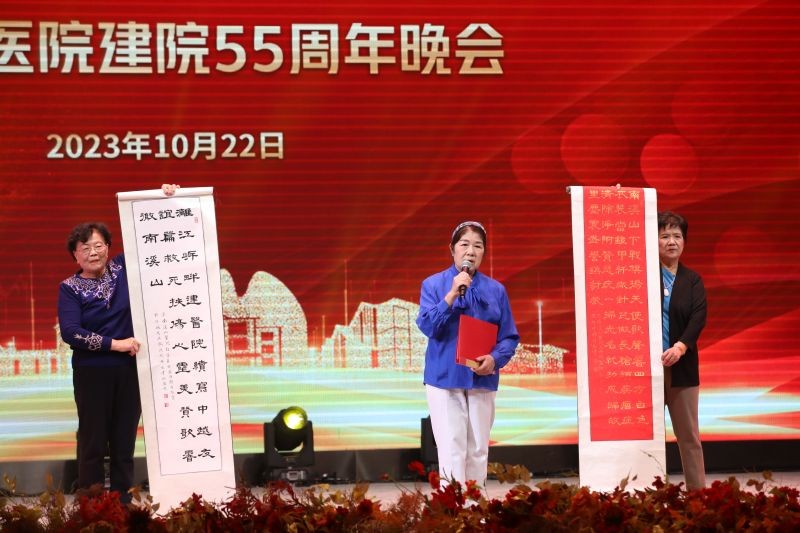 从北京专程到医院参加建院55周年系列活动的援越时期老职工在晚会上深情朗诵了老职工们创作的七律。