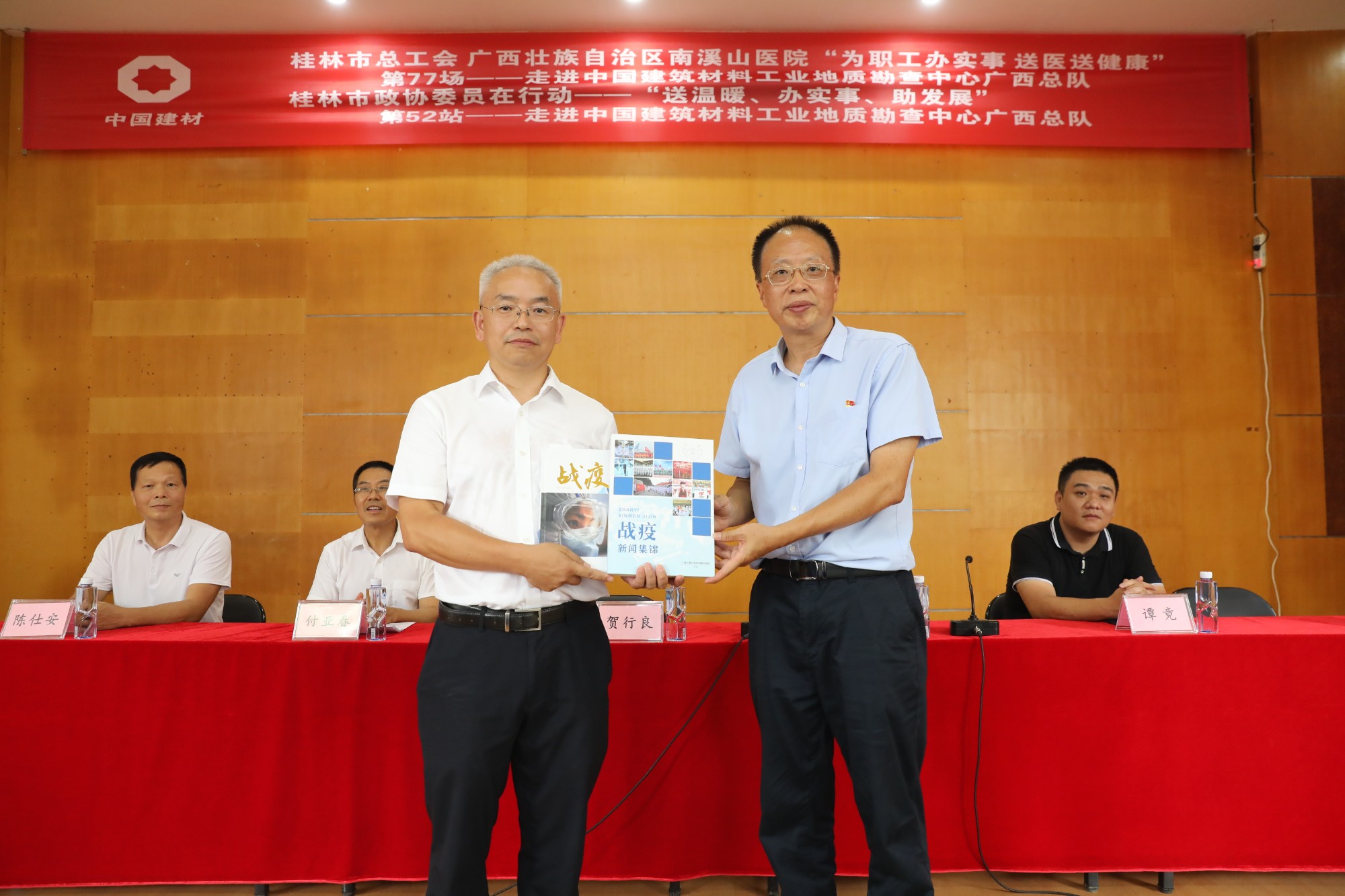 南溪山医院领导(右)向中国建筑材料工业地质勘查中心广西总队领导赠书医院《抗疫》书籍。戚雅妍 摄