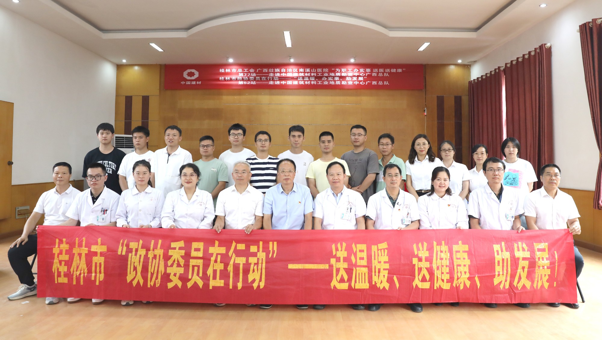 参加活动的医务人员和中国建筑材料工业地质勘查中心广西总队的领导、职工在一起。