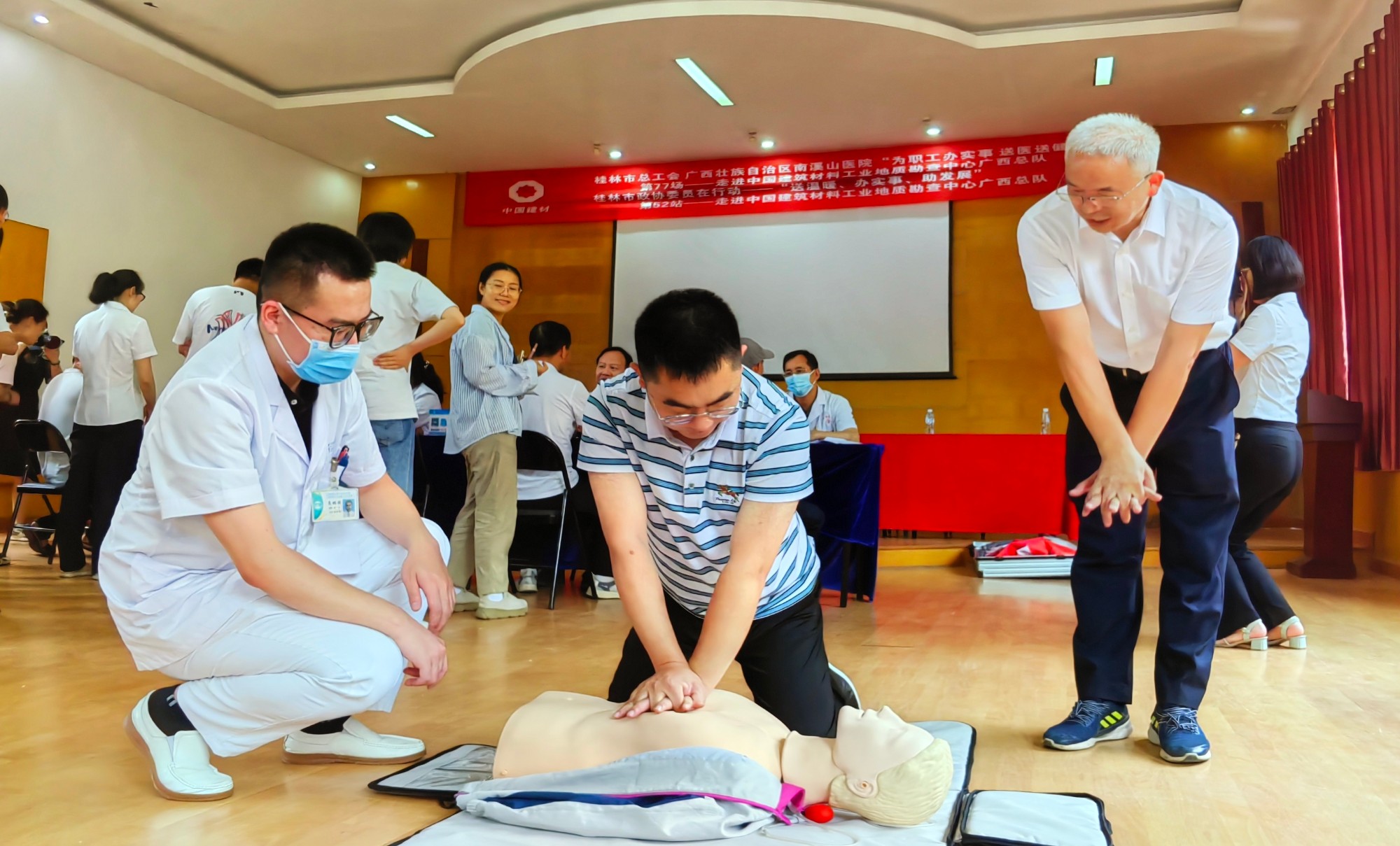 在医护人员的指导下,一名地质职工接受徒手心肺复苏的培训。张超群 摄