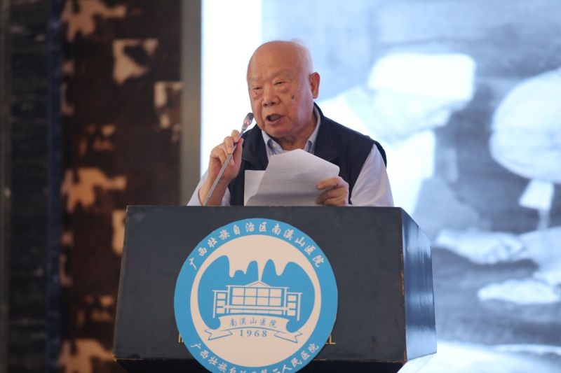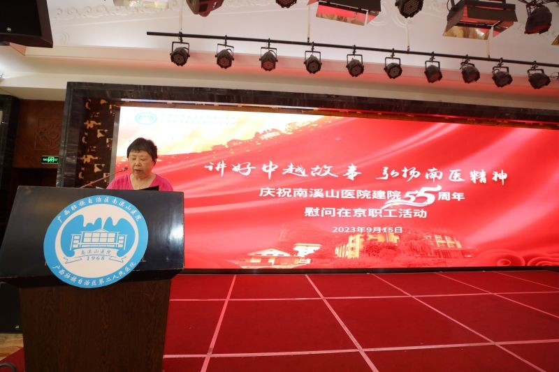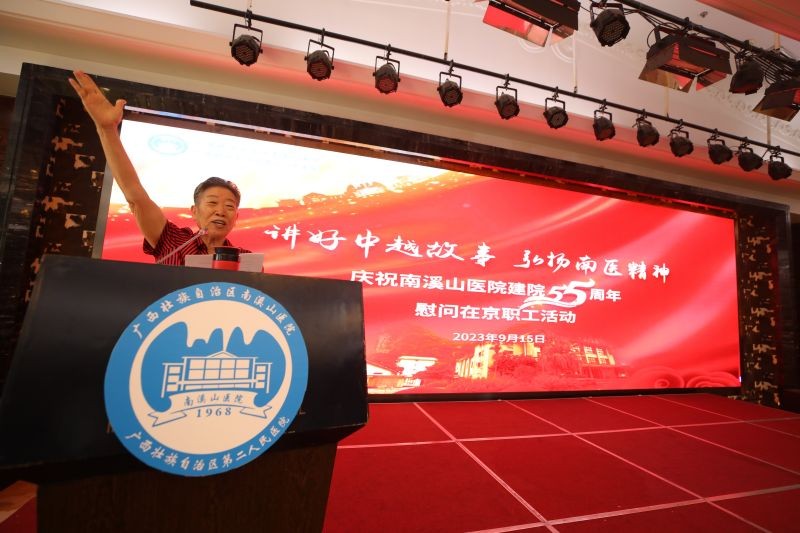 座谈会上,南溪山医院党委书记柳宏林代表全院职工亲切慰问了全体在京老职工,与他们追忆往昔,盛赞他们是中越友谊的践行者、中华文化的传播者和南医精神的开创者,并向他们汇报了医院发展改革的情况,感谢他们为中越友谊做出的巨大贡献和为医院发展打下的深厚根基,并表示将不负嘱托通过高质量发展全力守护好健康广西北大门。最后,柳宏林正式邀请老职工和南医子弟们55周年院庆时桂林再聚首。望着一幅幅旧照,南溪山医院的一草一木让老职工和南医二代们仿佛梦回当年,感慨万千,他们抑制不住激动地心情,尽情诉说着对医院的感情和彼此的怀念。代表老职工们发言的国家名老中医周德安深情说道:“我们南医人永远铭记那战斗的友谊岁月,那一群不穿军装的战士、不出国的援外医疗队和没有编制的外交官。南医精神就是爱党爱国无私奉献的爱国主义精神,南医精神就是救死扶伤实行革命人道主义的国际主义精神。我们要继续发扬南医精神,传承南医精神!”