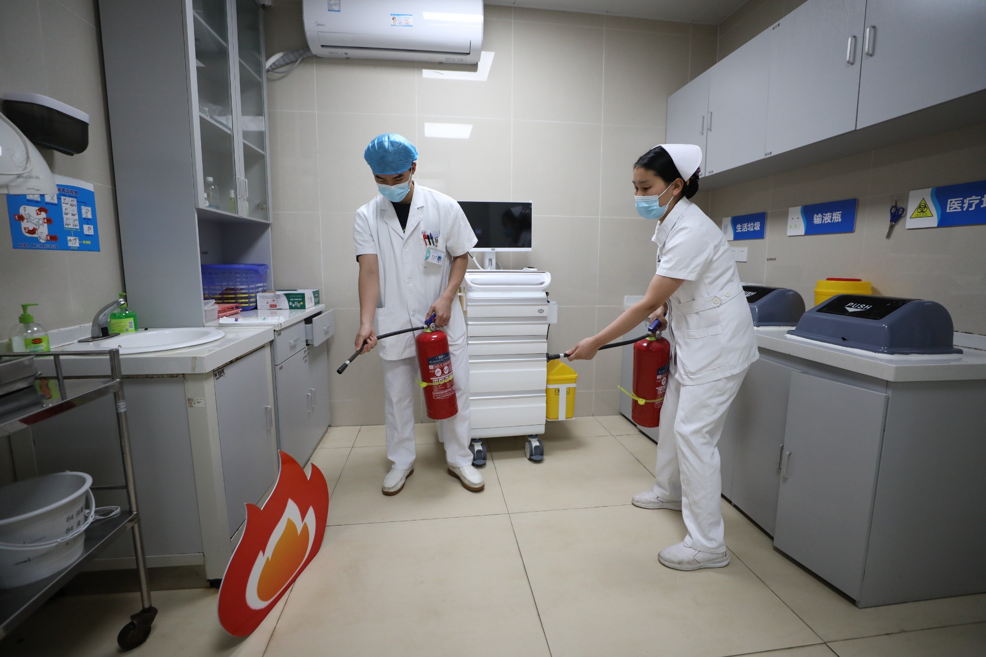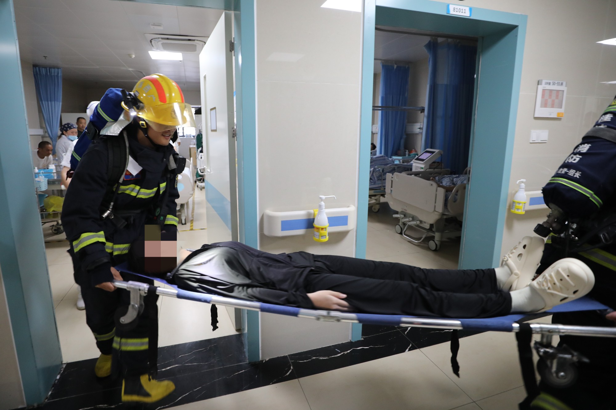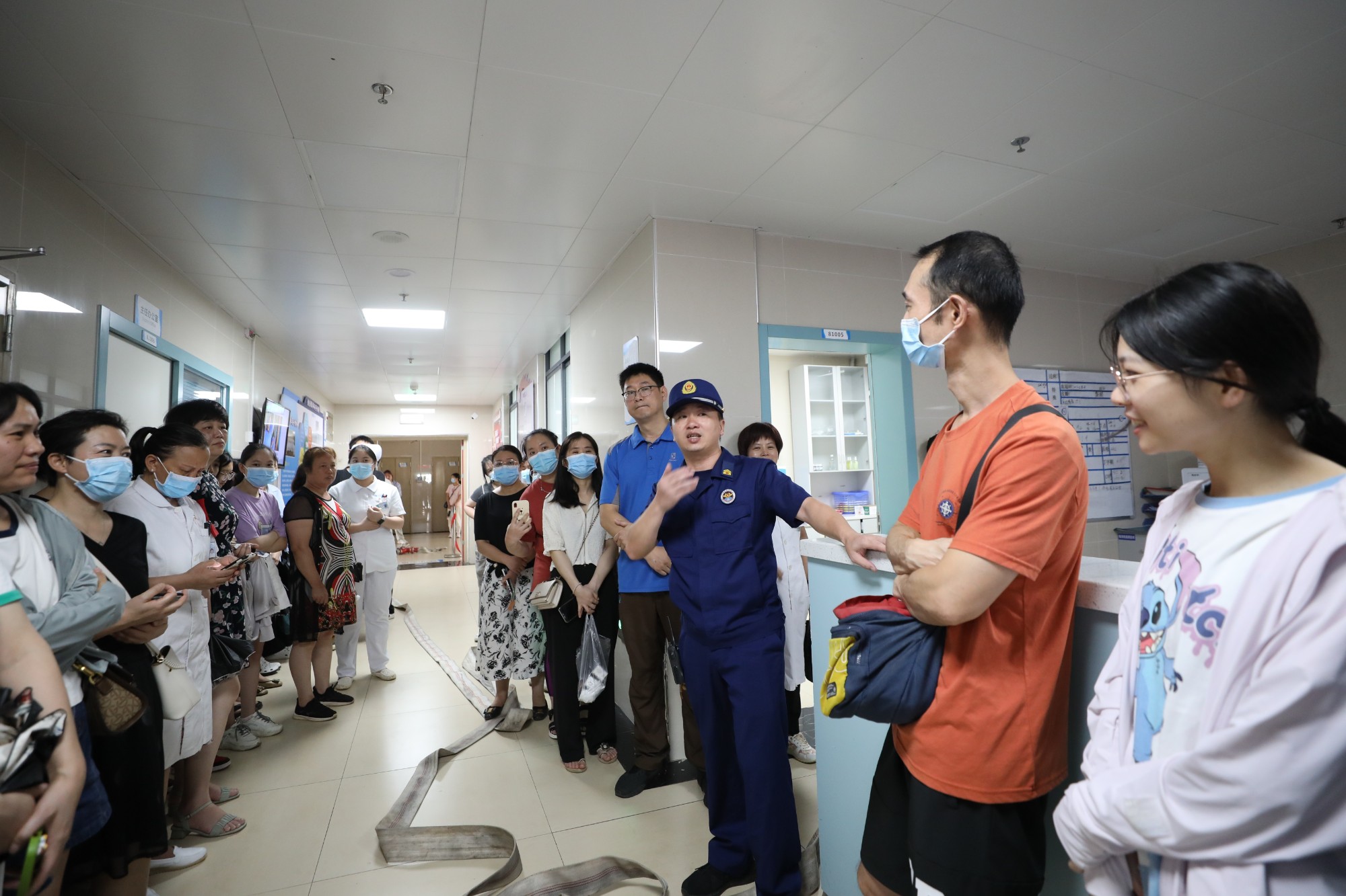 培训会结束后,该院在住院部8号楼1楼创伤骨科手外科病区进行了消防应急疏散演练。演练内容包括模拟突发火情、科室处置初起火灾和报警、组织疏散逃生、市消防救援支队消防官兵演示到达现场接替灭火任务和火场被困患者转移等,消防救援支队官兵还现场指导医护人员进行灭火演练,让医护人员亲身体验如何扑救初起火灾。