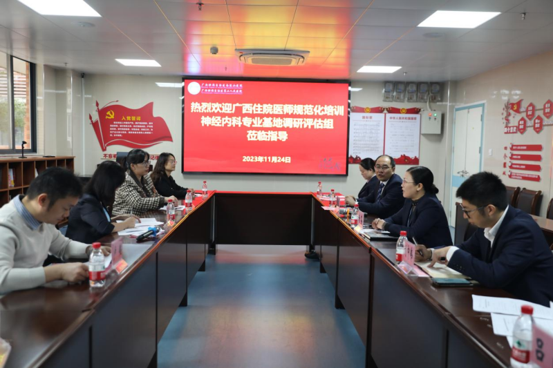 为加强住培基地内涵建设,11月24日上午,受自治区卫生健康委科技教育处委托,广西住培工作指导委员会神经内科调研评估专家组组长、广西科技大学第一附属医院副院长黄进瑜一行5人到自治区南溪山医院开展2023年全区住院医师规范化培训神经内科专业基地督导工作。南溪山医院副院长唐芬、教学管理科副科长刘中伟和医院神经内科专业基地管理人员、指导医师代表等参加汇报会。