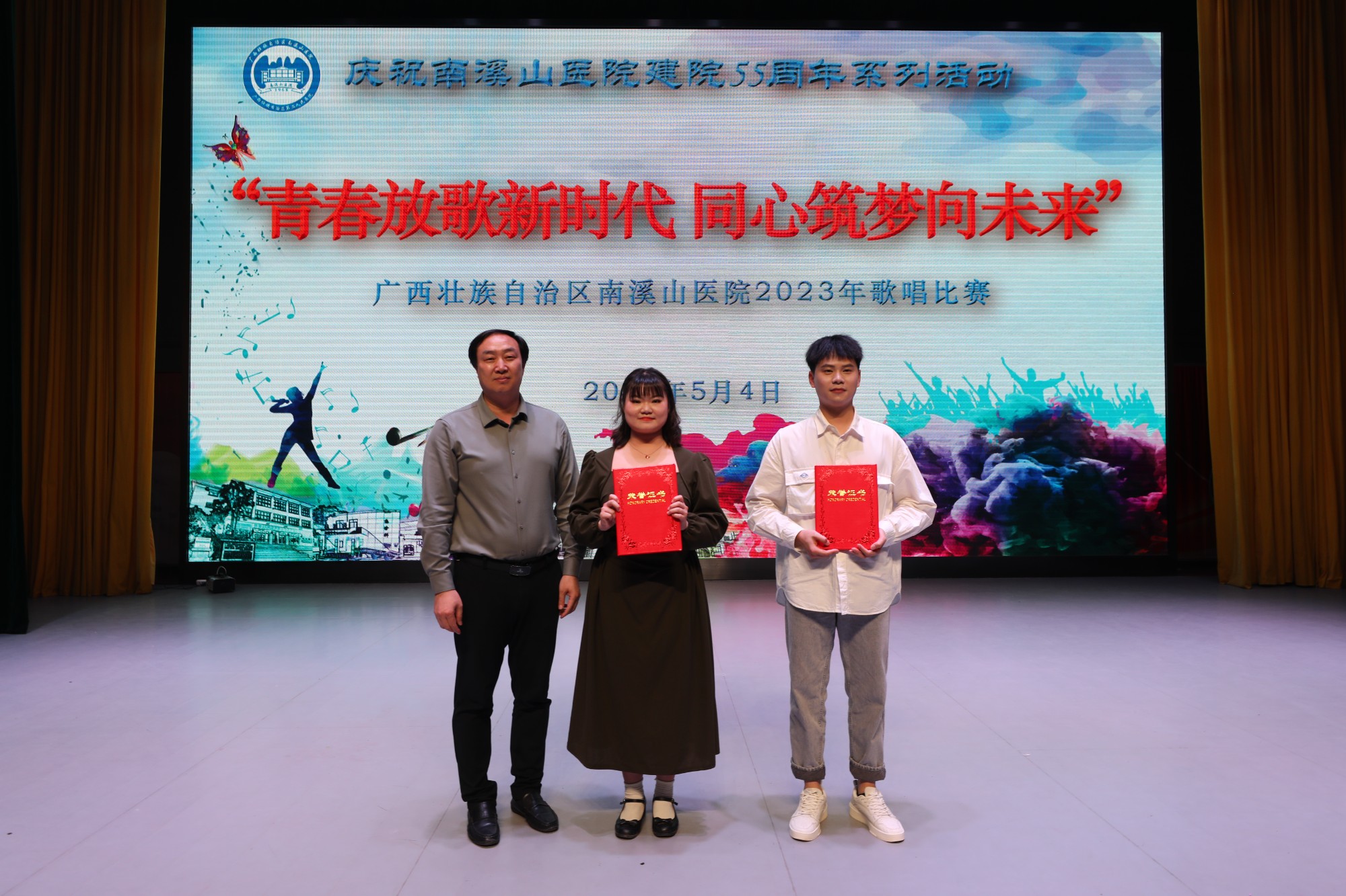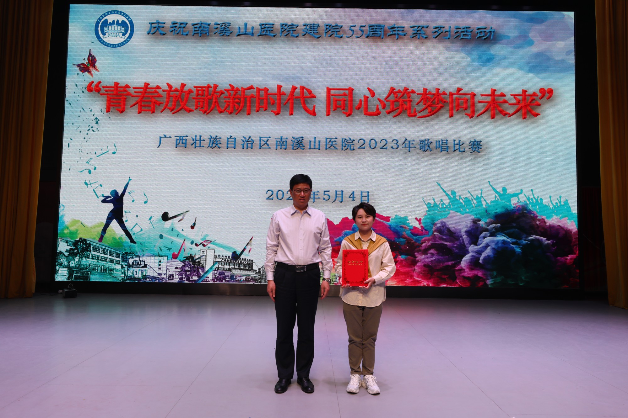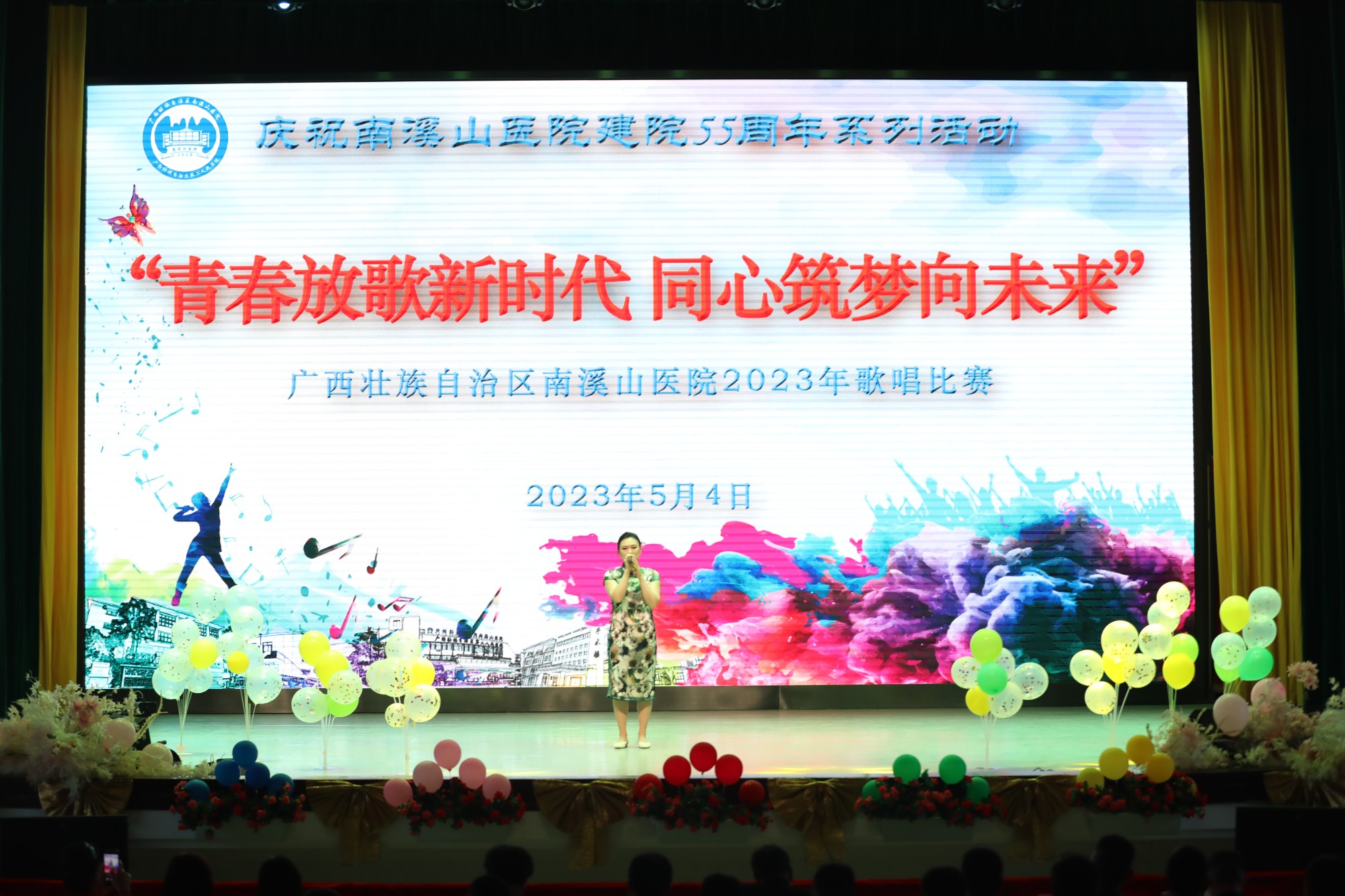为庆祝五四青年节,丰富医院职工文化生活,5月4日,广西壮族自治区南溪山医院团委、工会、护理部联合在该院大礼堂举办2022年度“五四”表彰大会暨庆祝南溪山医院建院55周年系列活动之“青春放歌新时代 同心筑梦向未来”歌唱比赛,这也是该院庆祝、纪念“五一”劳动节、“五四”青年节和“5·12”护士节的主要活动。