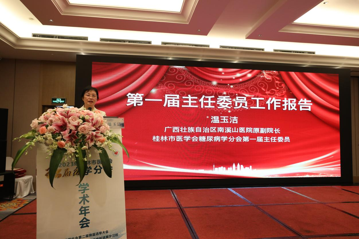首先举行的是糖尿病学分会第二届换届选举大会。桂林市医学会糖尿病学分会第一届主任委员温玉洁教授回顾了第一届专委会的工作历程及取得的成绩,祝愿糖尿病学分会在新任主任委员带领下再创佳绩。