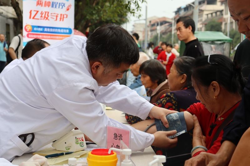 义诊现场,由各党支部医护人员组成的专家团队耐心地接诊每一名群众,耐心地为他们答疑解惑。护理人员现场为群众测量血压、血糖等,针对血压高、血糖高的群众,医生则会指导他们按时服药、准确服药,并现场给他们赠送药品,向他们强调按时服药的重要性。